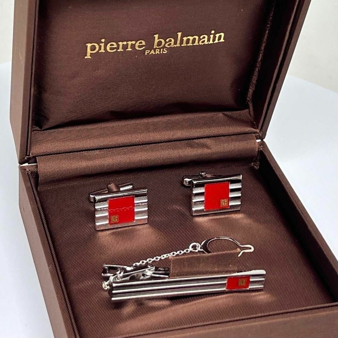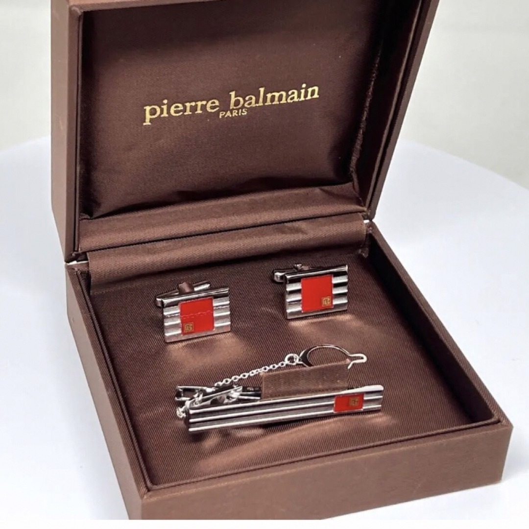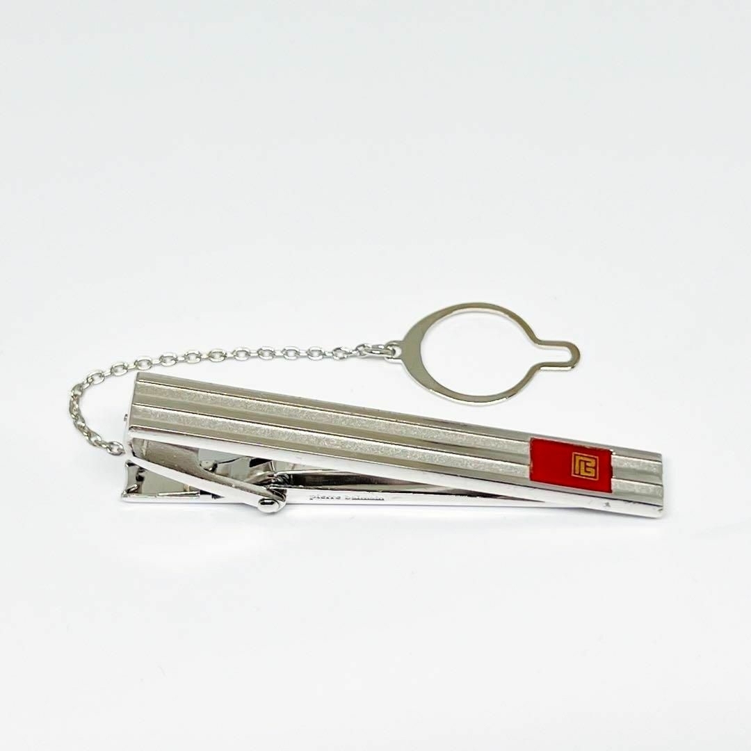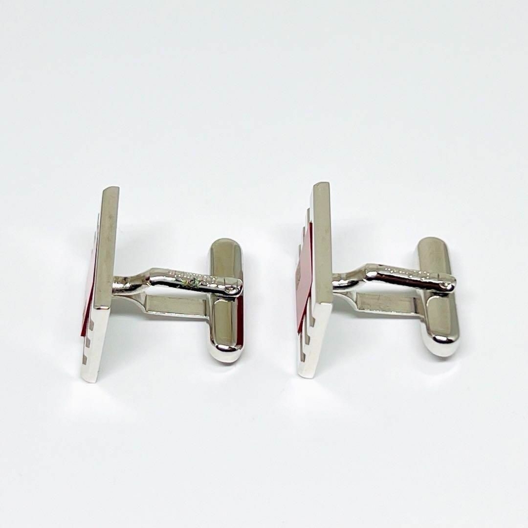 シルバー×レッドデザインがお洒落なカフリンクスとネクタイピンのセットです。