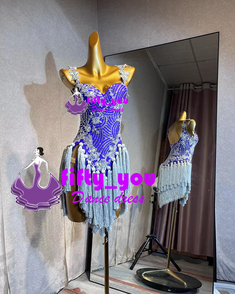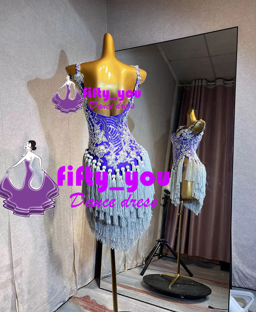 新品fifty_you セミオーダードレス レディース社交 ダンスドレス  ラテンドレス パーティドレス フリンジ飾り パープル