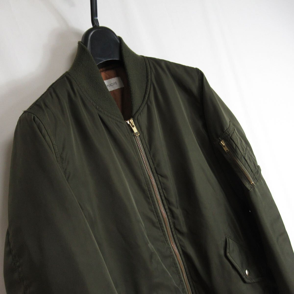 Simplicite の 【 シンプリシテェ 】 の MA-1 ブルゾン です。美しい光沢の伺えるサテンライクな表情に洗練されたシルエットが素敵な一着。オーセンティックなミリタリーアイテムながらモダンな雰囲気に昇華されております。お探しの方は是非ご検討下さい。
