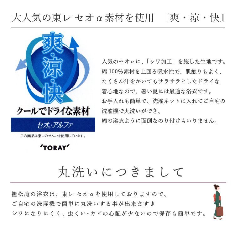 | 商品説明 | ご家庭の洗濯機で洗える「東レ・セオα」生地の夏着物(浴衣) |