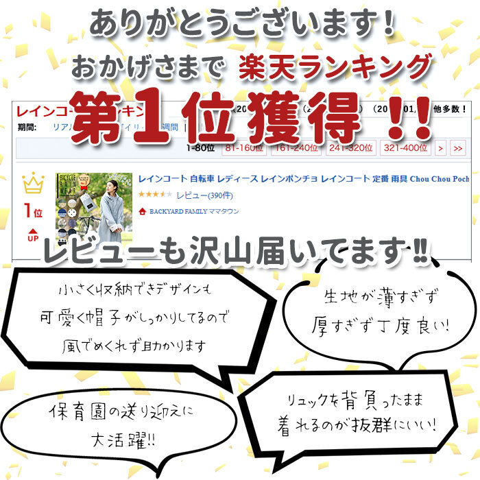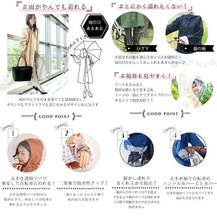 商品説明 | 雨の日も自転車に乗りたい方へオススメのレインポンチョです。大きめの透明ツバで視界も良好!傘なしで自転車に乗れます♪裾がしぼれてまくれ上がりを防止します。フロントジッパーで着脱も楽々♪大きめの袖はハンドルごと覆うので雨から手を守ります。 |
