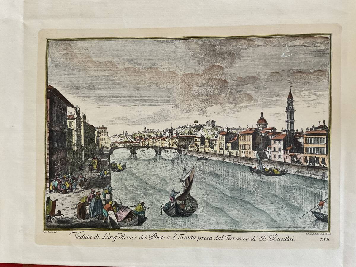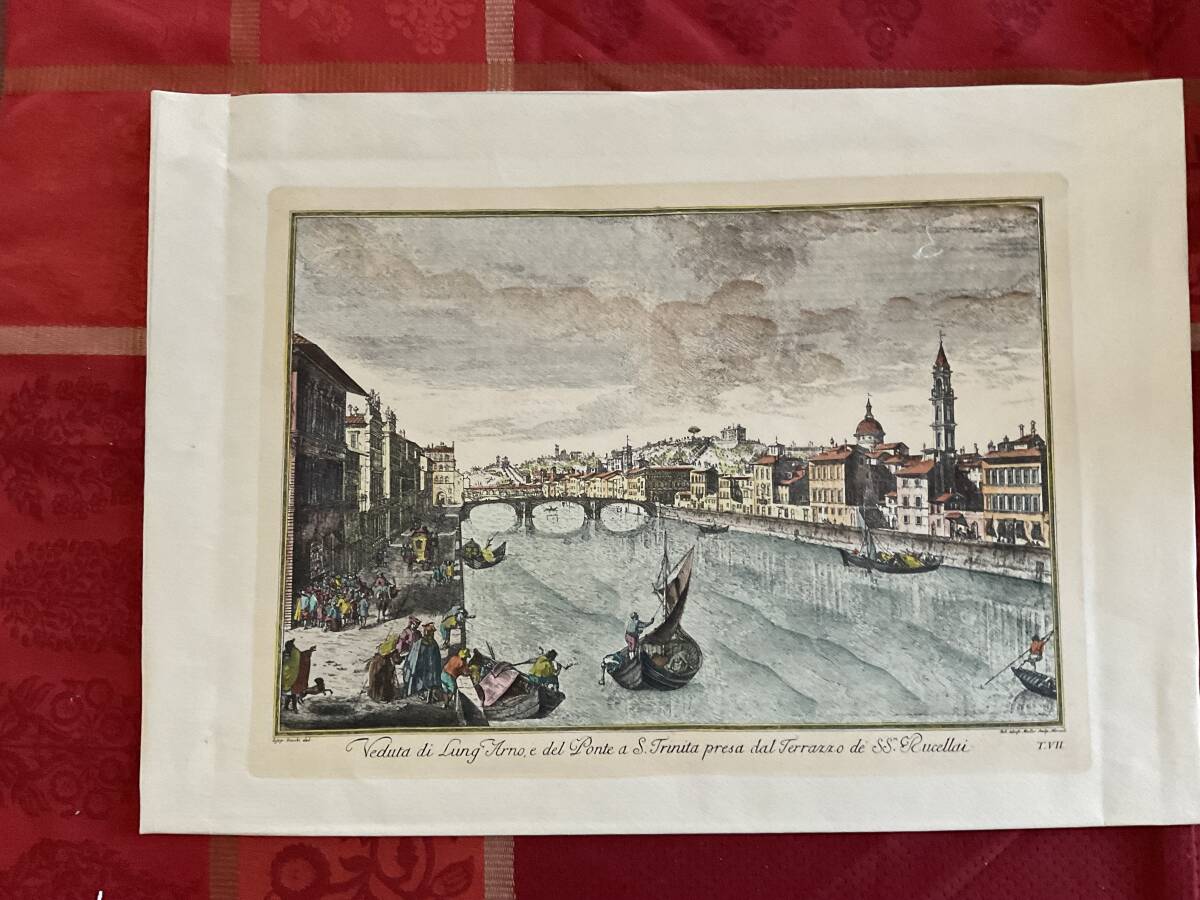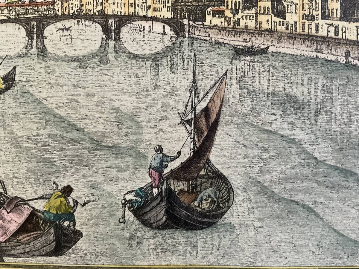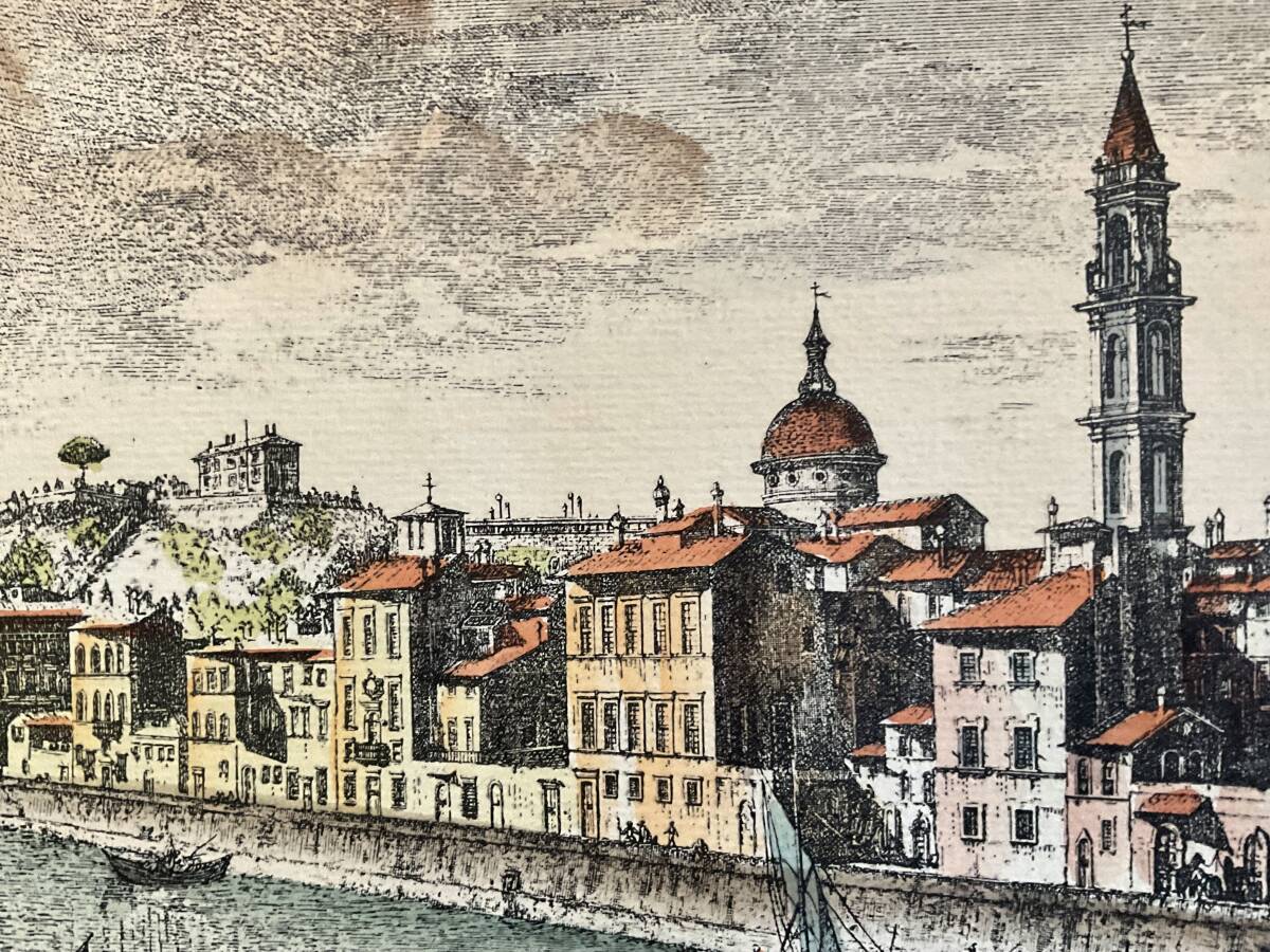 エッチングに手で彩色を施した物です フィレンツェ アルノ川の風景です