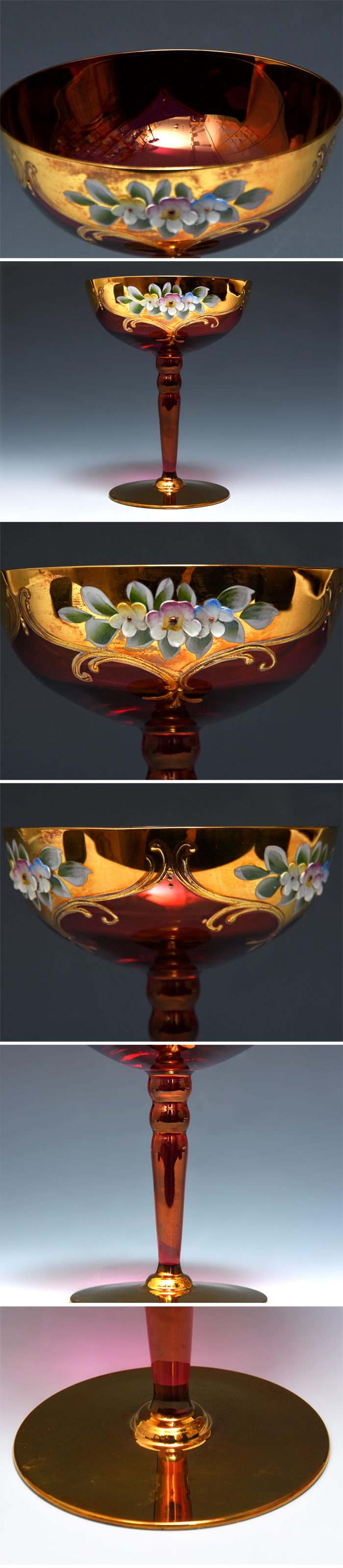 1950年頃にオーストリア「Famosa LPW」にて製作された美しいグラス6客セットです。 明るい発色の赤いガラスの素地にハイエナメル(エナメル絵付と焼き付けを何度か繰り返し立体的に仕上げる技法)を施しています。 レッドとゴールドのコントラストに白い花模様がアクセントとなった華やかな作品で、飾り映えもいたします。 経年によるわずかなスレやヨゴレなどが見られますが、底面には当時のシールがそのまま貼られており、総じてコンデションは良好です。 ※撮影の際に生じた写り込みなどがございます。 ご理解の程よろしくお願い致します。 |