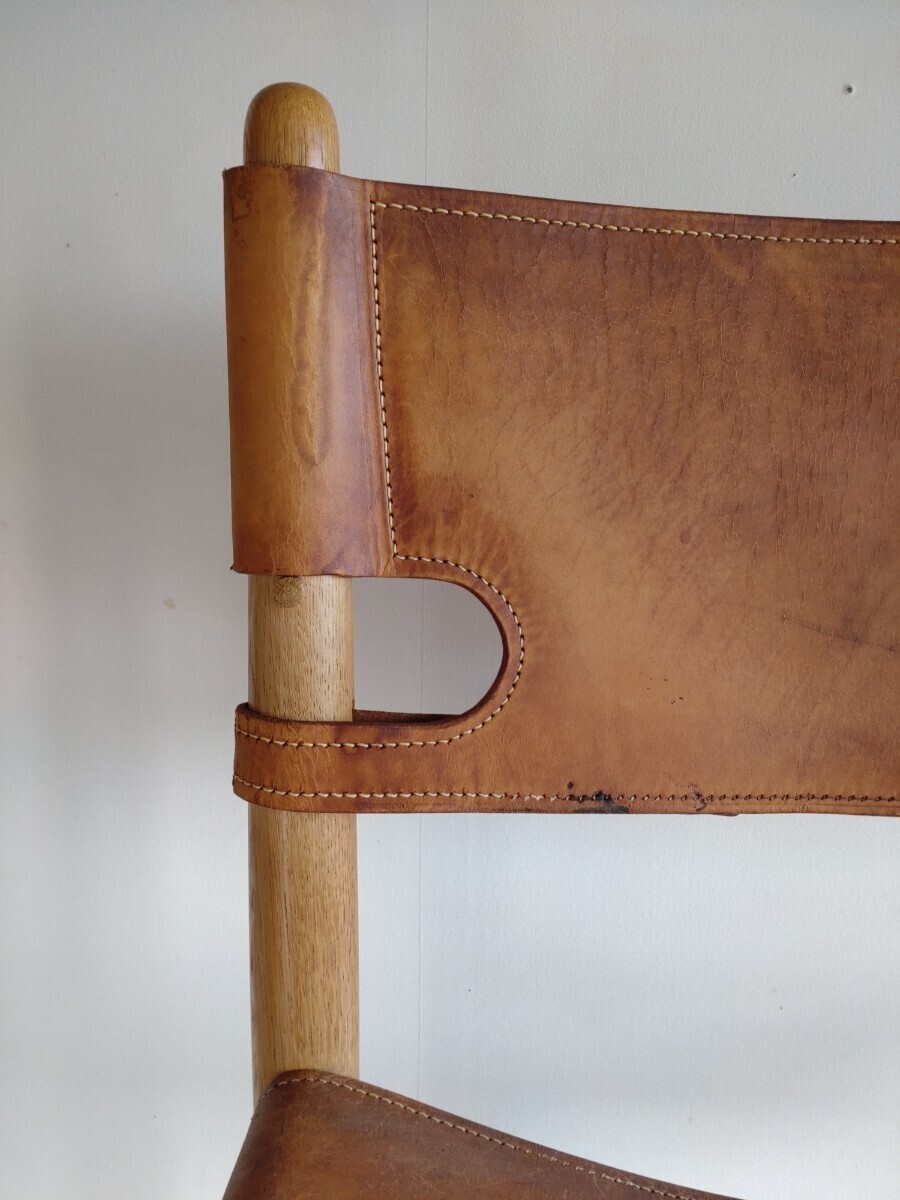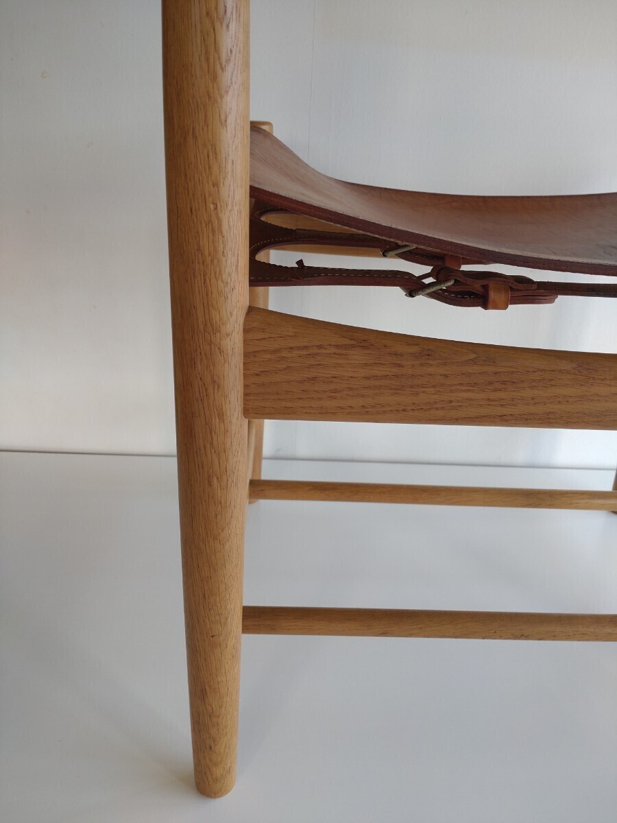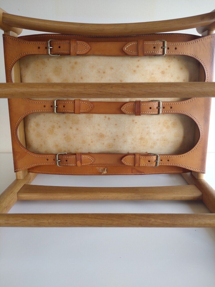イージーチェア仕様の“スパニッシュチェア”が有名ですが、こちらのダイニングチェアが先にデザインされて長らく生産されていませんでしたが、2018年にFredericia(フレデリシア)から復刻しました。長年の使用により伸びてきた革を座面下のバックルにて革の張り具合を調整できます。長く使っていただくことをモーエンセンは念頭にいれてデザインをしています。このバックルも真鍮で仕上げ見た目の美しさが際立ちます。