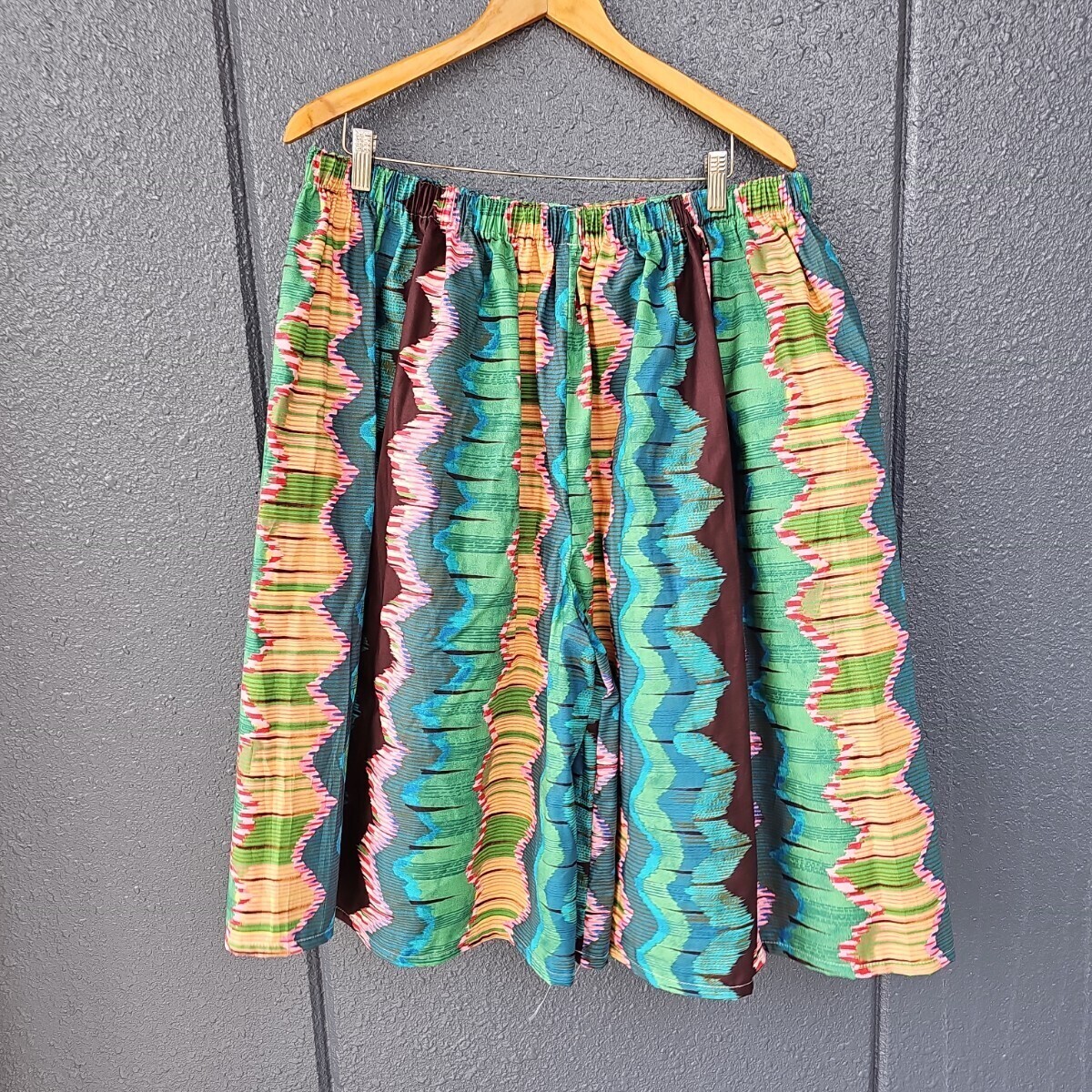 出来上がりサイズは平置きで、ウエスト(総ゴム)33cm、ヒップ108cm、裾幅54cm、総丈(ゴム部含めて)68cm、股上38cmです。採寸の誤差はご理解ください。