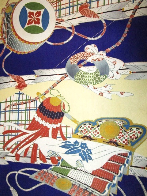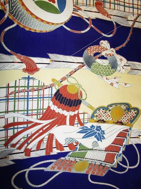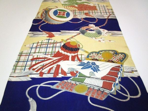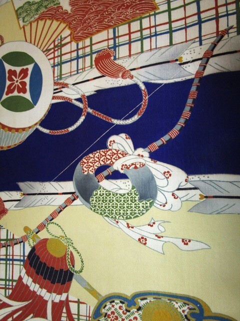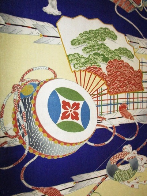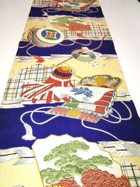 男5-90★鞍*弓矢*扇*太鼓*松*桐*正絹*古布はぎれ★一閑張り/襖絵/屏風絵/アンティーク