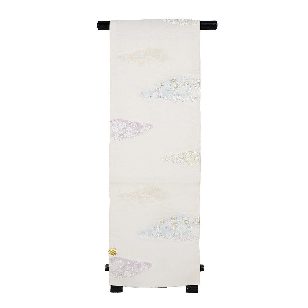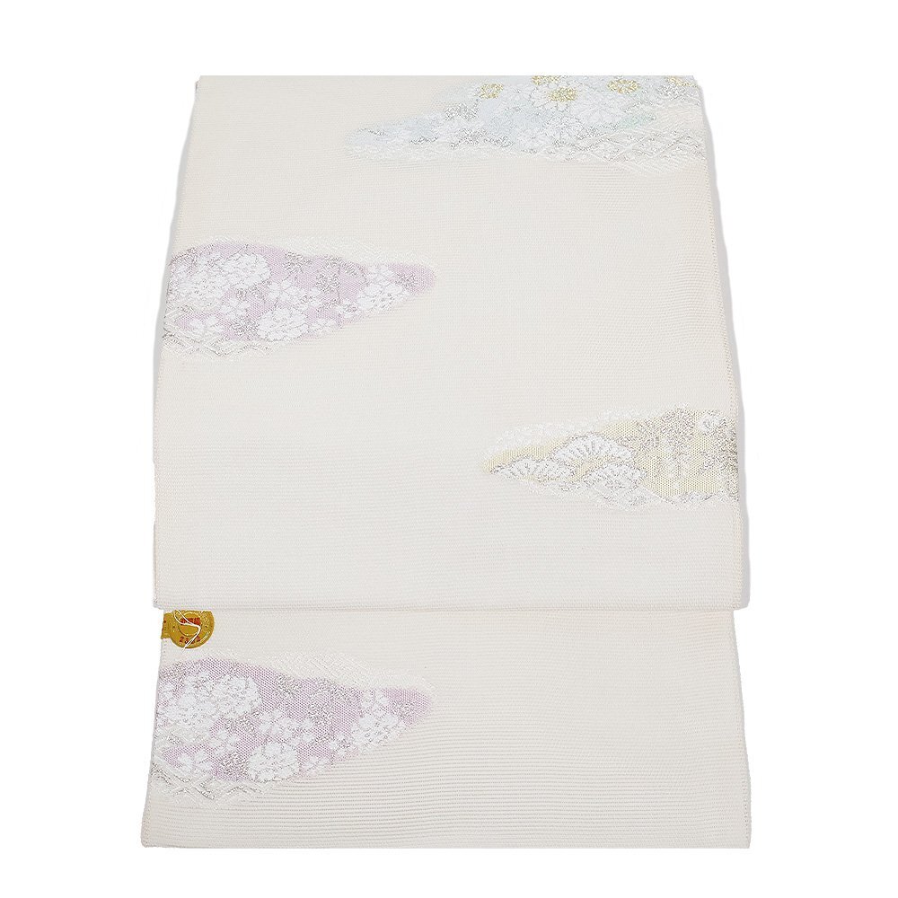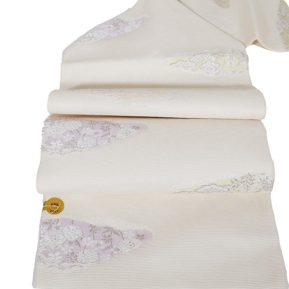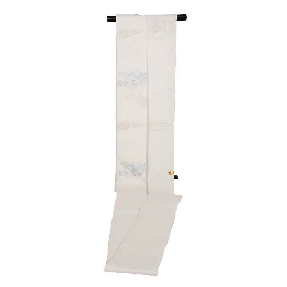 | 株式会社京都イシハラ謹製 絽 九寸名古屋帯 オフホワイト地 縫い取り・宝尽くし・菊・桜・松・雲文 新品 仕立て上がり | |