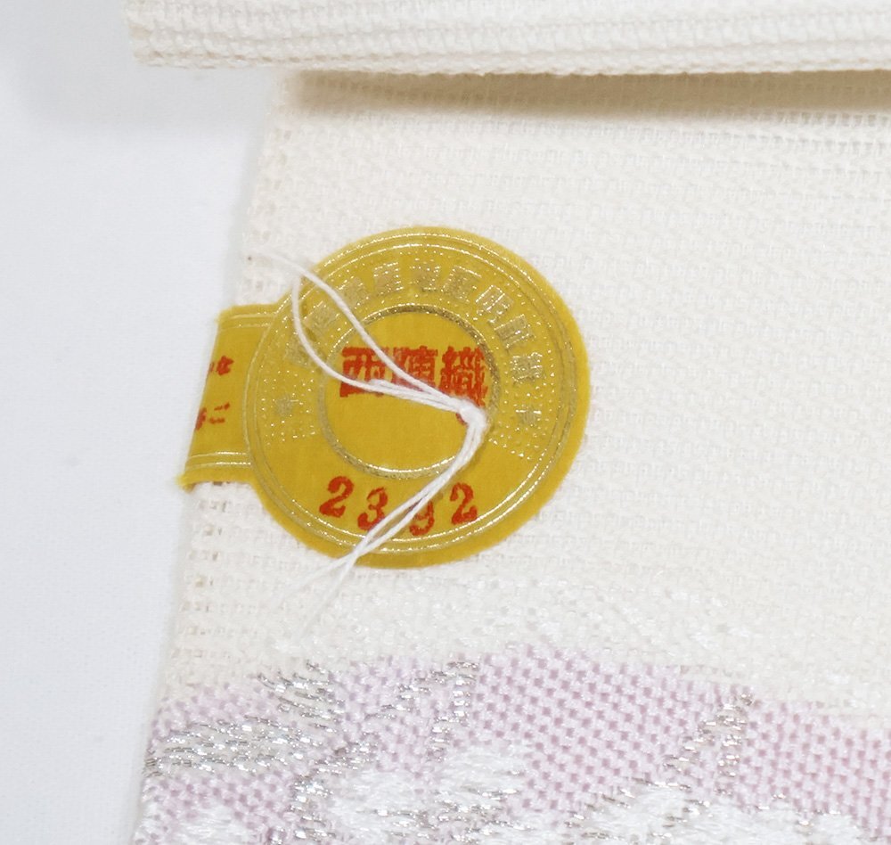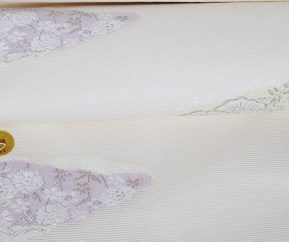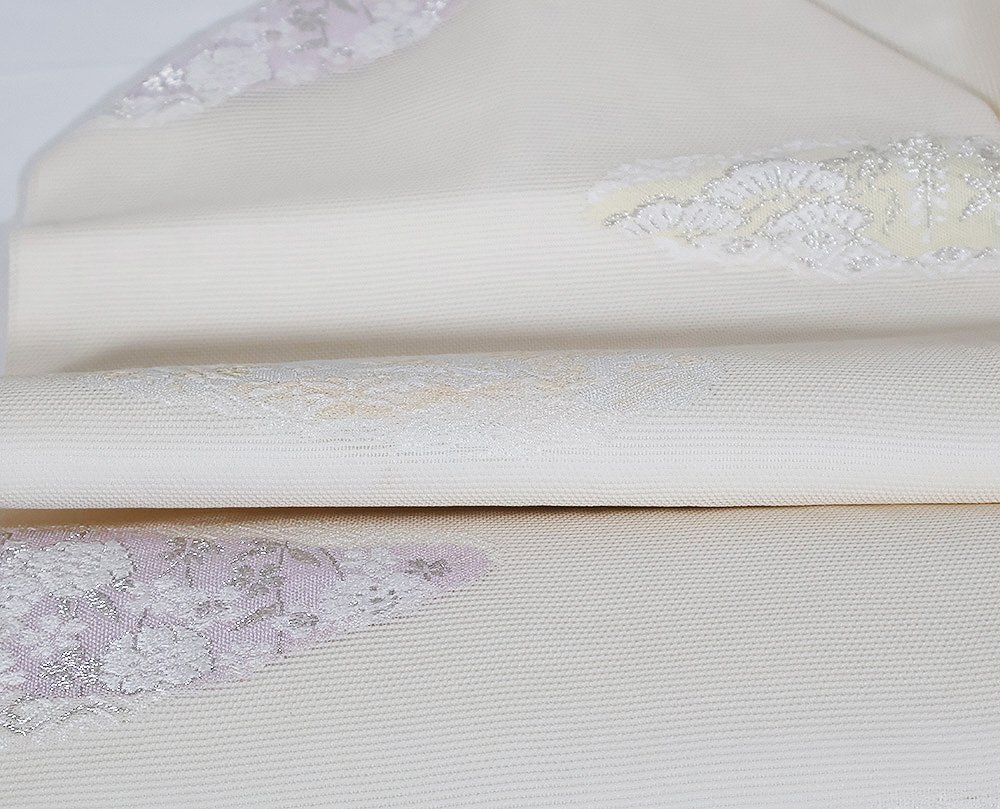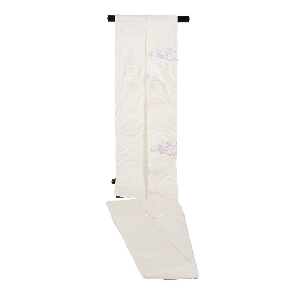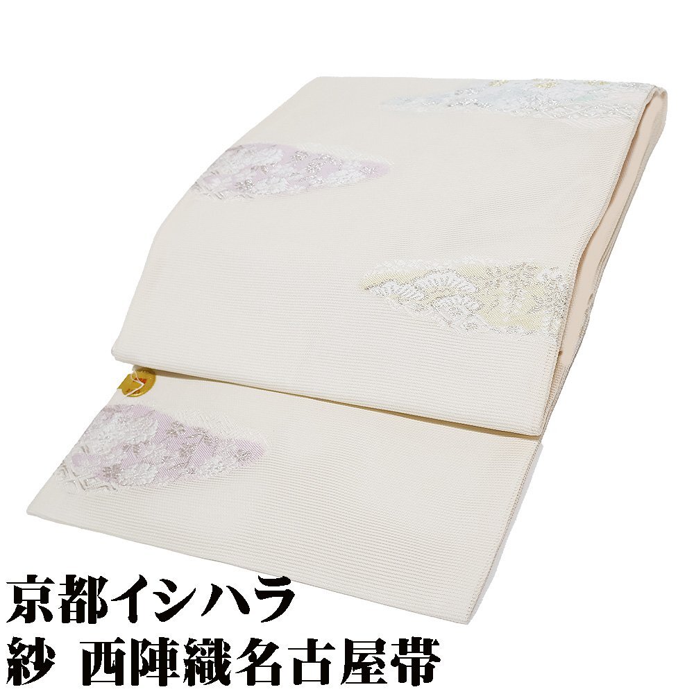 | 株式会社京都イシハラ謹製 絽 九寸名古屋帯 オフホワイト地 縫い取り・宝尽くし・菊・桜・松・雲文 新品 仕立て上がり | |