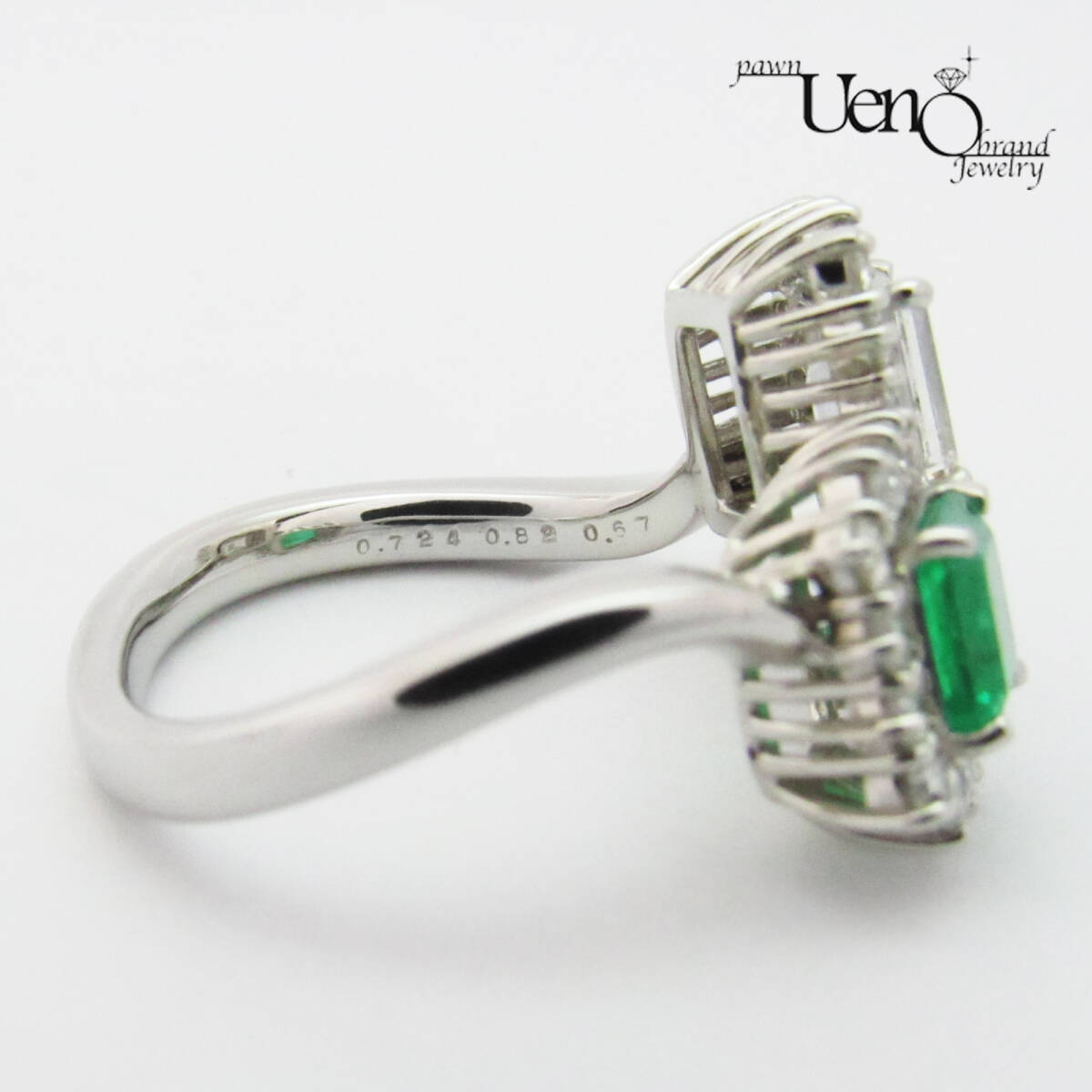 | 詳細 | 刻印 <Pt950><0.724><0.82><0.67> エメラルド(縦・横約5㎜) ダイヤモンド(縦約5㎜・横約4㎜) |