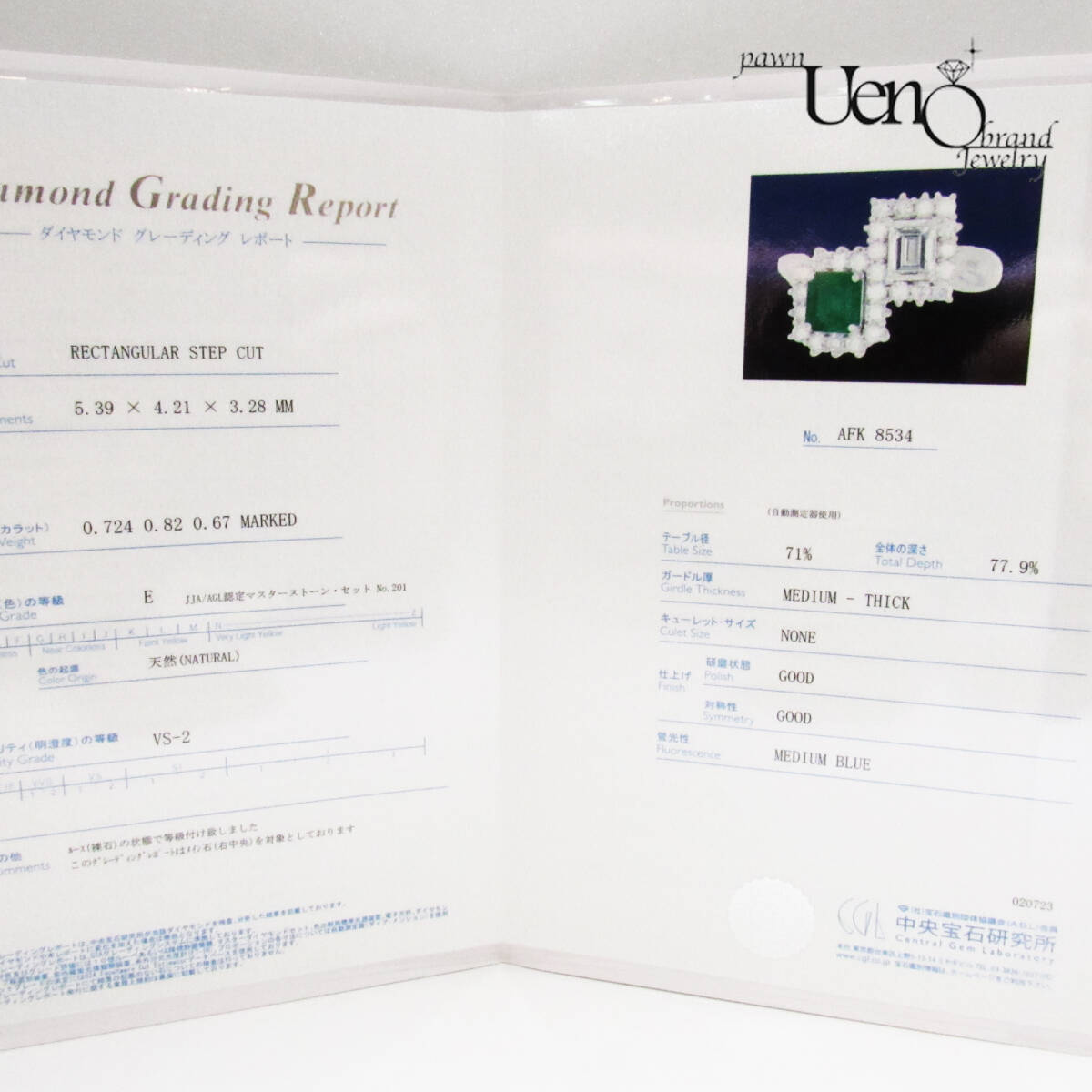 | 付属品 | 当店の箱をお付けいたします。 ノーブル ジェム グレイディング ラボラトリーの鑑別書と中央宝石研究所の鑑定書が有ります。 (鉱物名 天然ベリル 宝石名 エメラルド 鉱物名 天然ダイアモンド 宝石名 ダイアモンド 脇石=天然ダイアモンド)※ダイアモンドは記載通りです※ (ダイヤモンド0.724 E-VS2) |