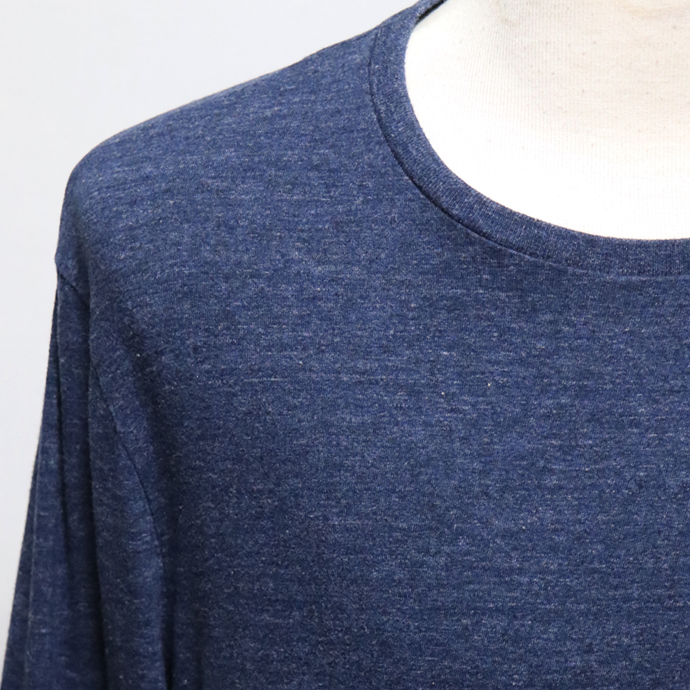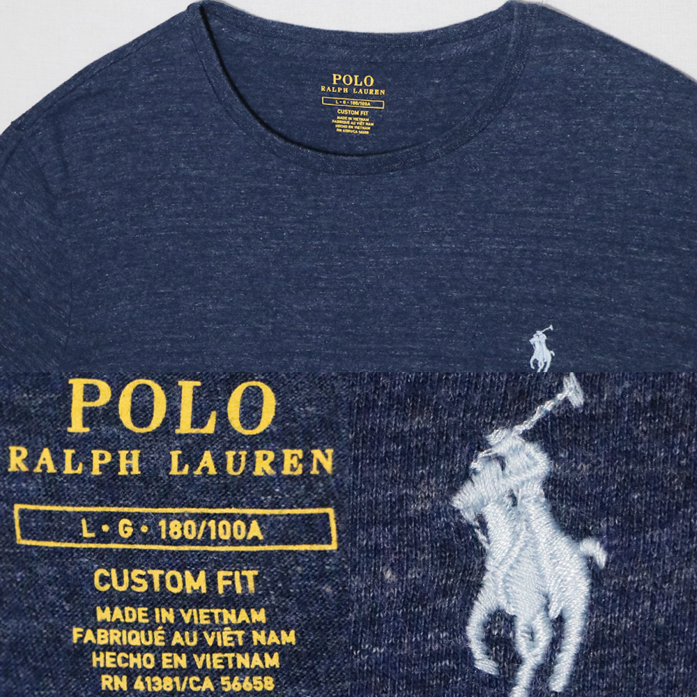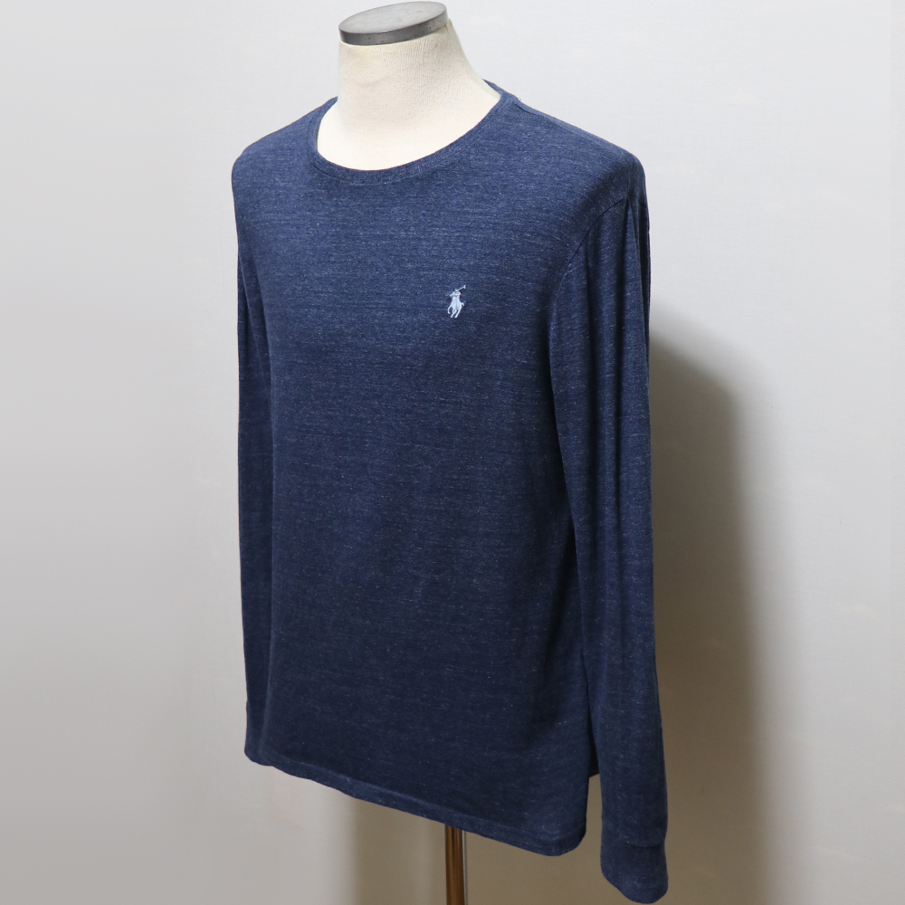 ラルフ定番の美しいシルエットのクルーネックロングTシャツ。肌触りの良いコットン100%生地に、 シックな杢ネイビー。水色のポニーのワンポイントが大人カジュアルな印象でとてもおしゃれです。