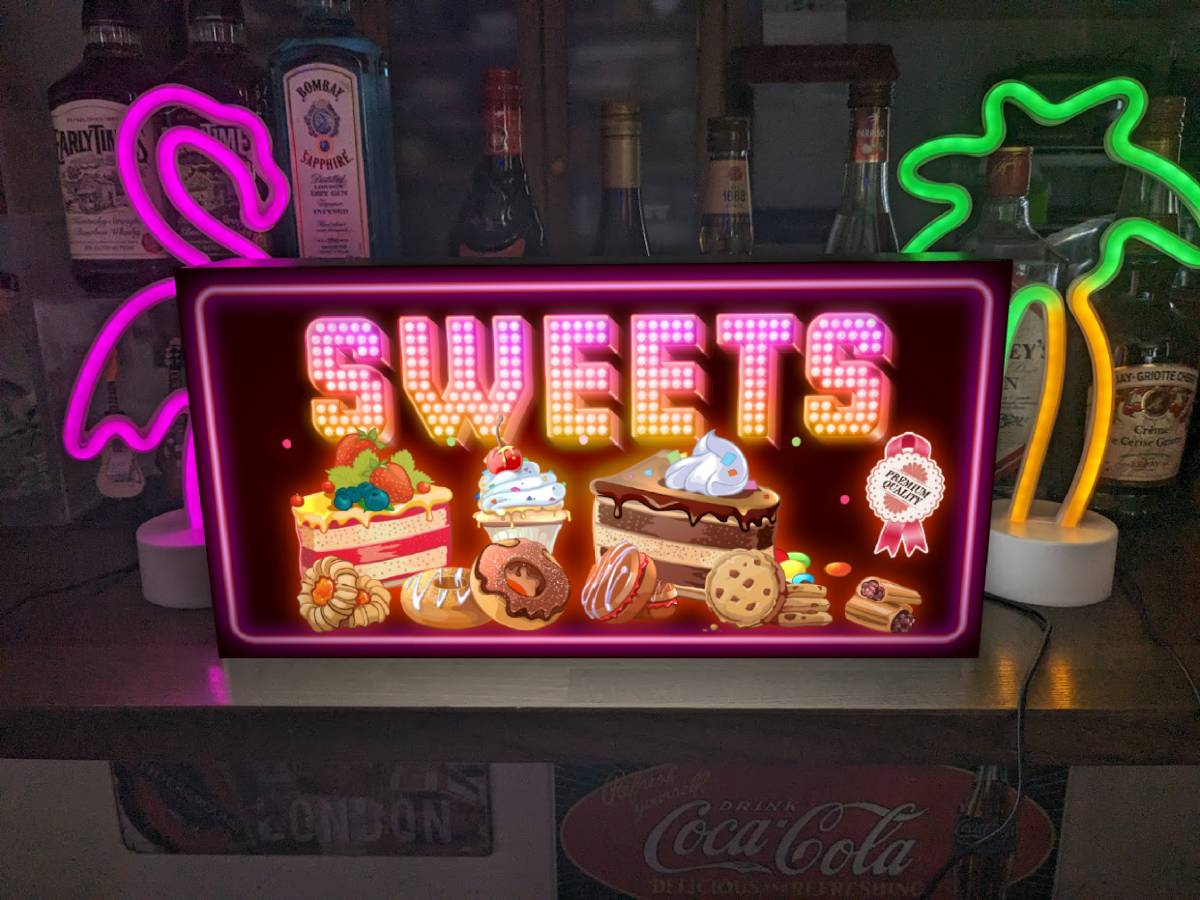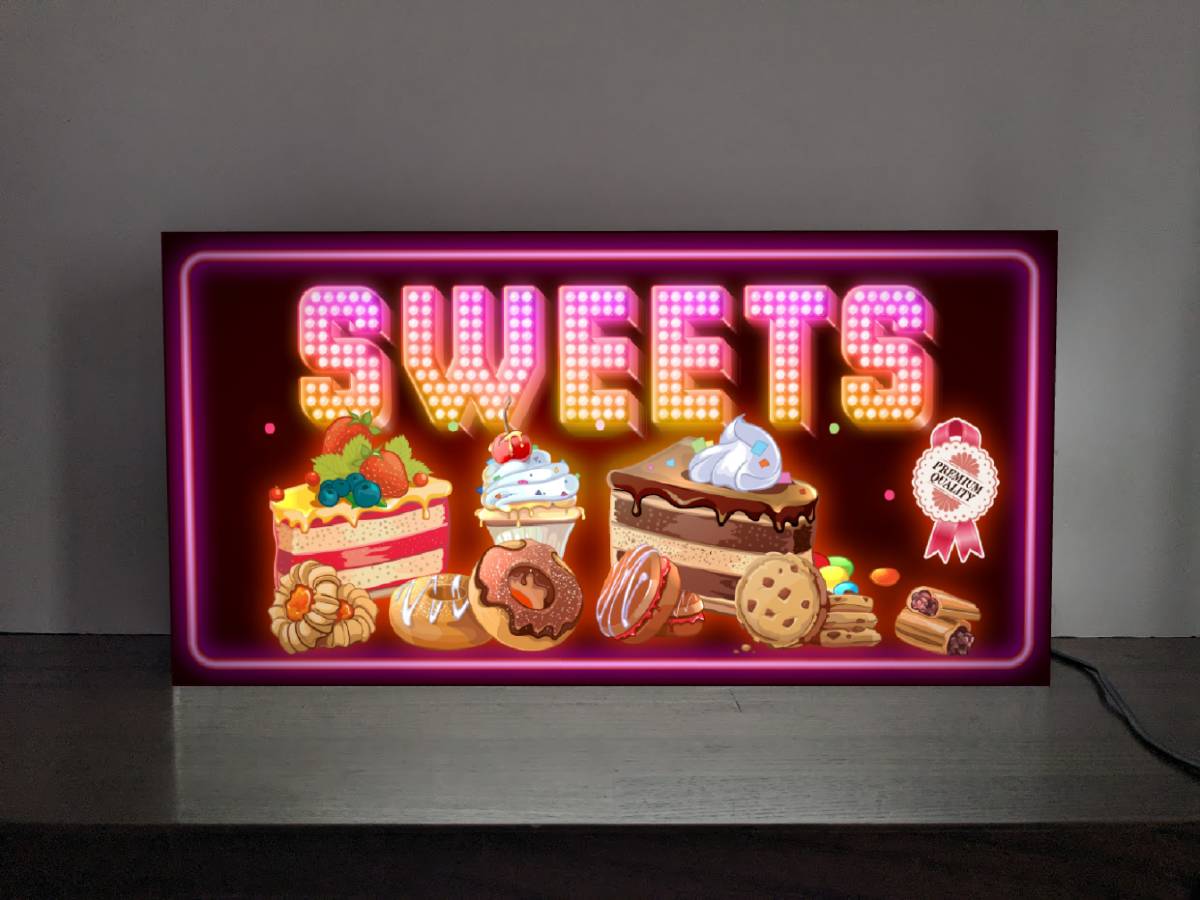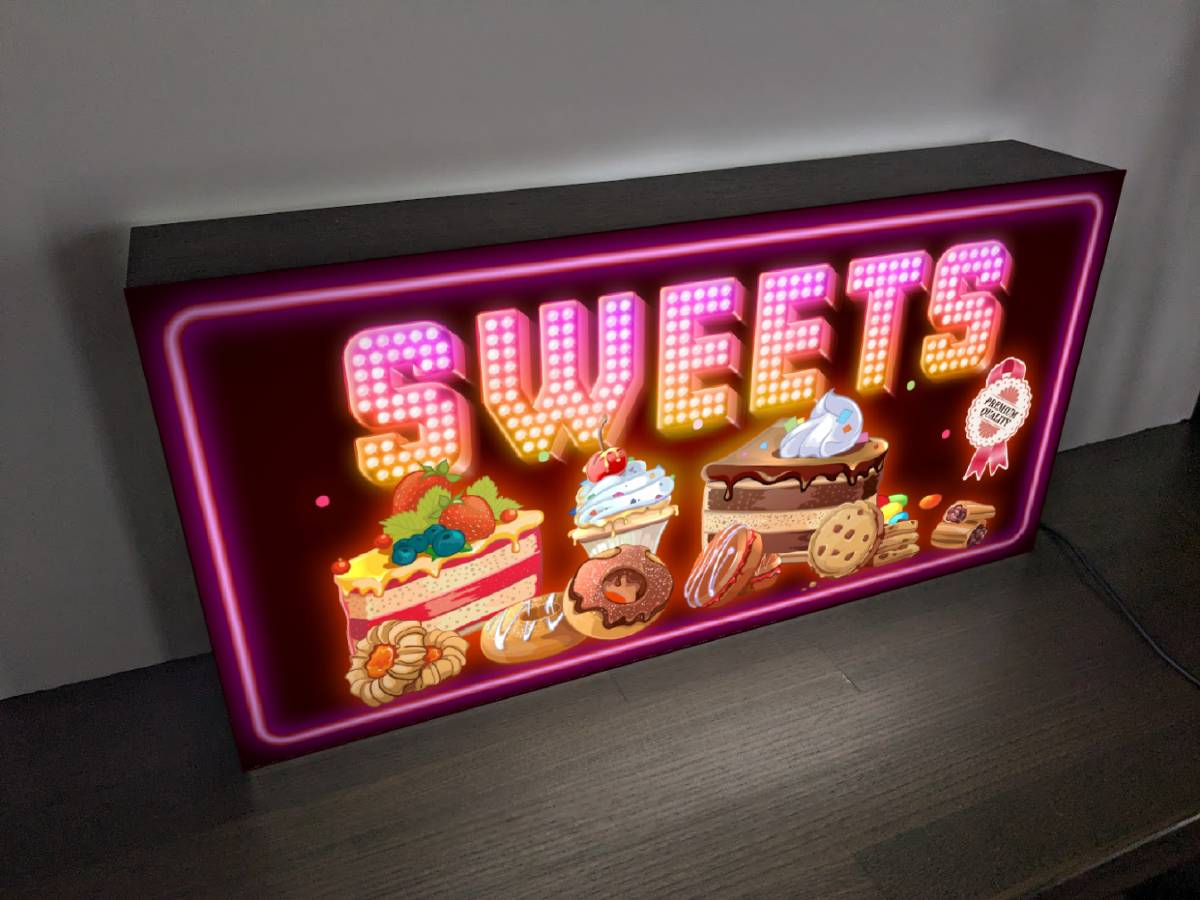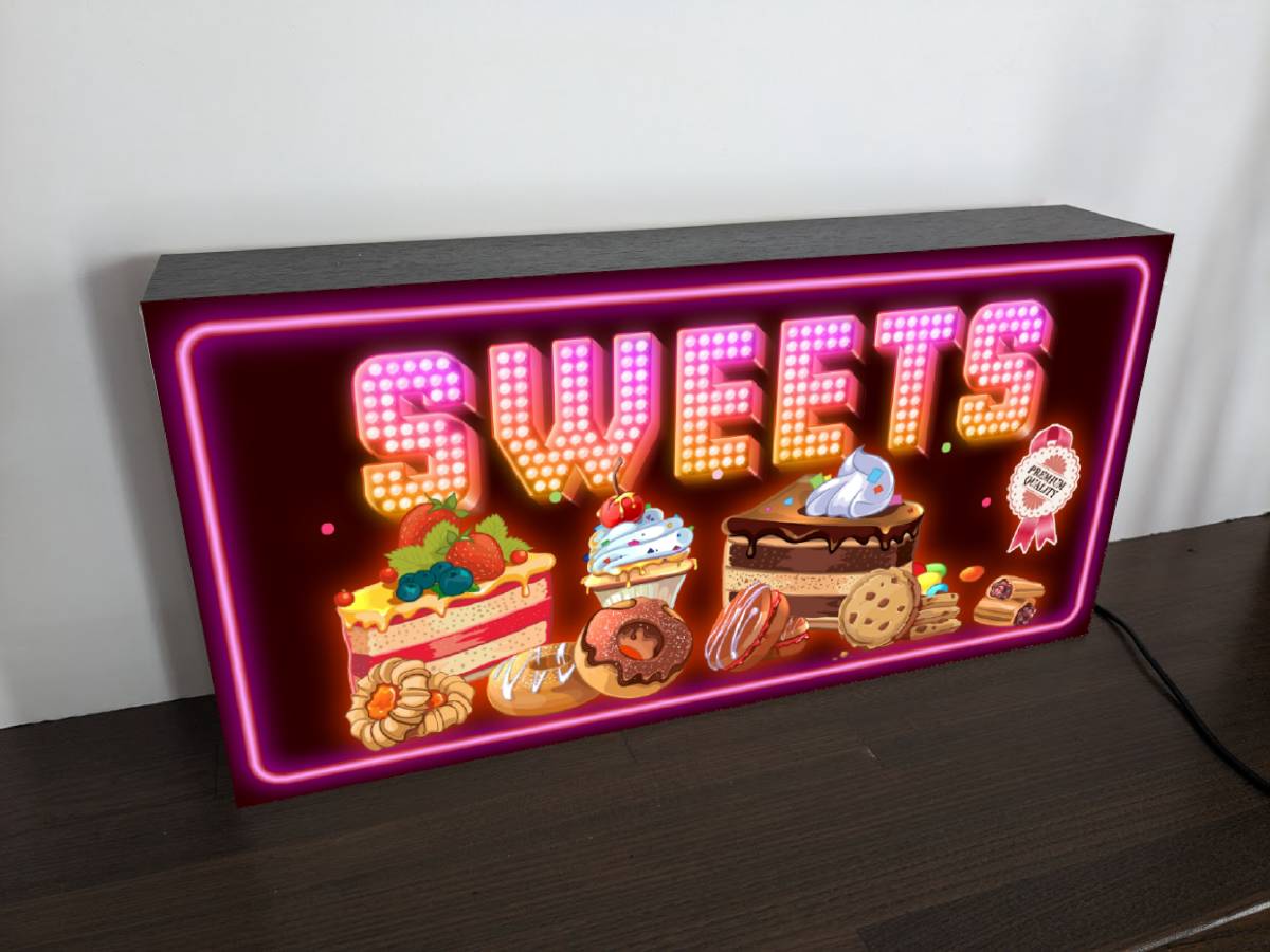 店舗、自宅、ガレージ、オフィスの窓際・カウンター・棚・テーブルやちょっとしたスペース、車内・キッチンカー・屋台・イベント・パーティーなどに 邪魔にならず丁度良い大きさの【スイーツ】電飾看板Lサイズです★ オーダー無料、プレゼントにも大変好評頂いております★ ◆サイズ◆20センチ×40センチ×奥行き7センチ ◆材質◆本体(アクリルプラスチック製)・表示面(IJバックライト発光フィルム貼り) ◆電源◆USB供給電源(家庭用コンセントコネクタ付き) 〇他サイズ〇 ●Sサイズ 75mm×150mm (3D造形BOX黒本体) ●基本サイズ10センチ×20センチ (3D造形BOX黒本体) ●Mサイズ 150mm×300mm ●LLサイズ 300mm×600mm ●3Lサイズ 400mm×800mm ◆オリジナルデザイン・オーダーも承っておりますので、お気軽にお問い合わせください。 自社製造製品 店舗 自宅 キッチンカー フードトラック 屋台 パーティー イベント サイン ランプ ライト 照明 看板 インテリア雑貨 置物 雑貨 テーブル カウンター 電飾看板 電光看板