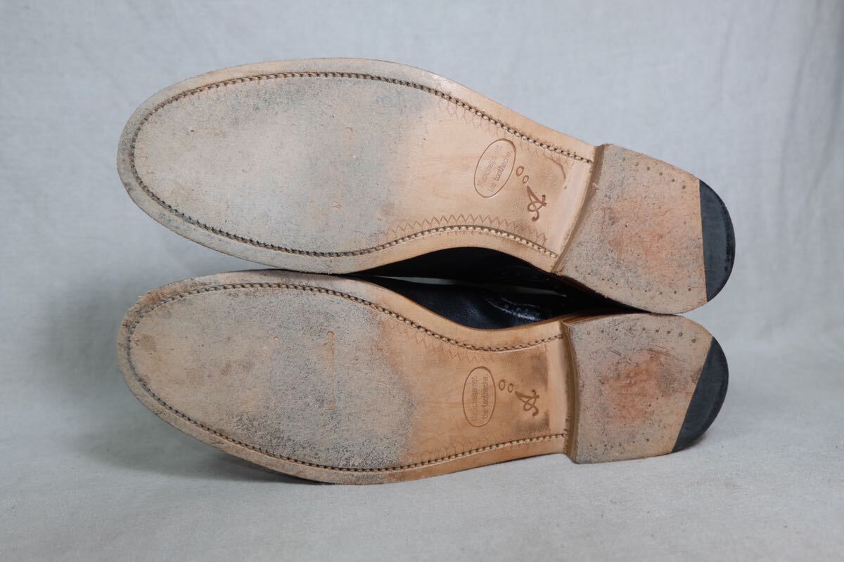 この度はアクセスありがとうございます。 イギリスの歴史ある老舗シューズファクトリーNPSにシューズブランドayakabiがオーダーした最高級カーフレザーを使用した革質、作り、デザインすべてが選び抜かれたサイドゴアブーツになります。永い時間をかけて作られた艶のある上質なカーフレザーをタフで堅牢なGoodyear welted製法で丁寧に仕上げた1足です。ソール、ライニング、インソール(中底)とすべてがレザーで作られたイギリスの伝統と美が詰まった仕上がりとなっております。レザーソールにクラシックなパターン、美しくエレガントな木型などNPSならではのハンドメイドが詰まった極上の1足です。 サンダース、チャーチ、トリッカーズ、ジョンロブ、オールデン、クロケット&ジョーンズ、JMウェストンなど質実剛健な本格靴がお好きな方にオススメです。この機会にぜひご検討よろしくお願いします。 サイズ:UK4(約22.5cm) 型: サイドゴアブーツ アウトソール:26.5cm ソール最大幅:9cm ソール:レザーソール カラー:ブラック 製産国:イギリス 素材:カーフレザー ライニング:レザーライニング 状態:10段階中【9】 アッパー:まだまだ永くご使用いただける美品です。 ソール:まだまだ永くご使用いただける美品です。 付属品:なし 基本的にはノークレームノーリターンなのでご不明点等あればお気軽にご質問、ご連絡ください。 注意事項 確認はしておりますが、中古品のため小さなキズ、汚れ等を見落とす場合があるので神経質な方はご入札をお控えください。 サイズはあくまで標準的なサイズ感なので、実寸やメーカーサイズをご参考頂きますようお願いいたします。 三日以内にご連絡いただけない場合、評価の末再出品させていただきますのでご了承ください。 | |||