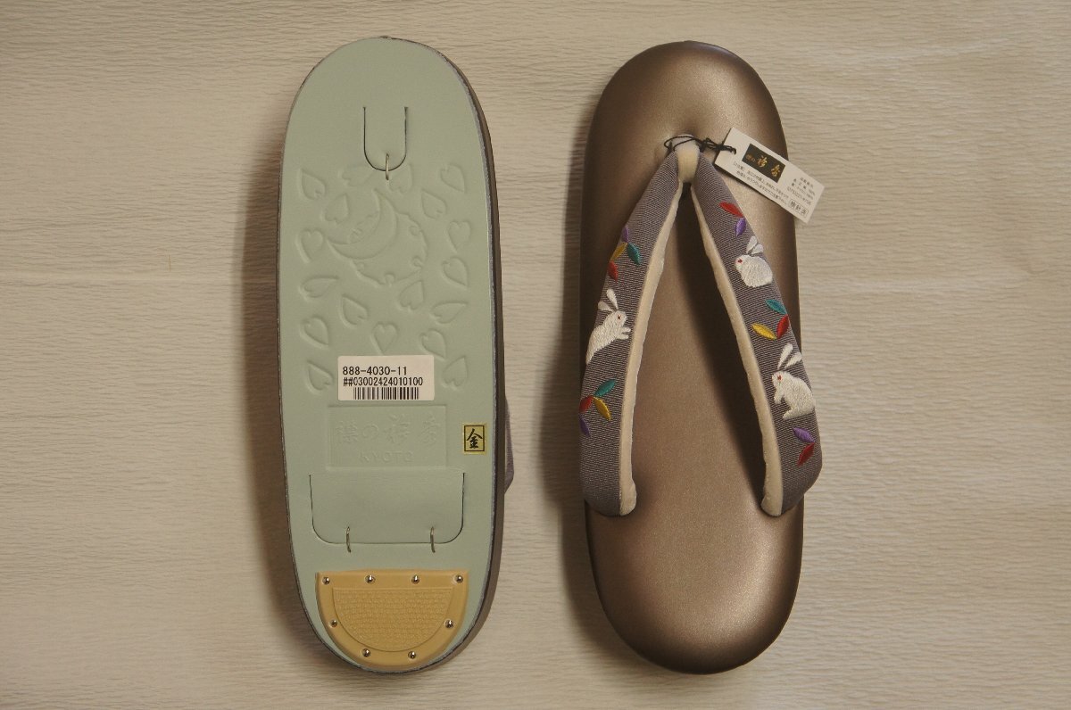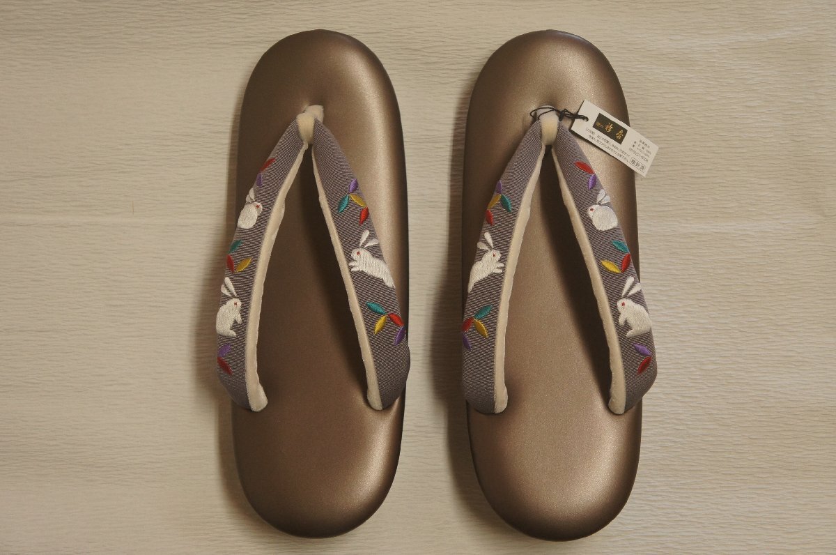 柄附牛革赤墨色地草履 鼻緒 グレー色地刺繍うさぎ七宝模様 ちょぼ うす練色