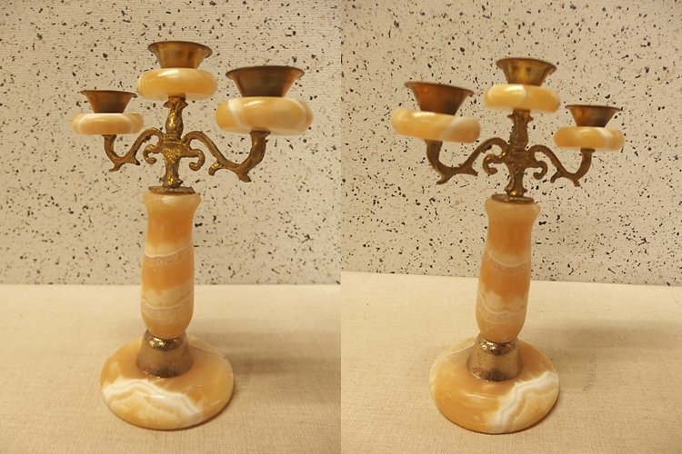 大理石調の燭台です。中古品。経年によってイタミが目立ち、難があります。サイズ:H24.5cm程度※外見に汚れ、スレ、イタミ、傷、金属部に割れ、ヒビがみられます。※多少ゆがみ、傾きがります。※予めご了承の上ご検討ください。以上のような状態ですが、よろしければどうぞ♪(^^)☆★☆---☆★☆---☆★☆---☆★☆---☆★☆---☆★☆---☆★☆---☆★☆---☆★☆---☆★☆
