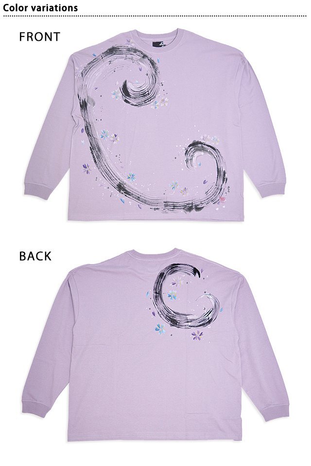 この道40年以上の「ぬれ描き友禅作家・碧三」が魅せる上品で繊細さが特徴の碧(あお)より「風に紫青花ビッグシルエット長袖Tシャツ」のご紹介です。 水墨画のようなタッチが魅力的な、味わい深い長袖Tシャツです。 フロント、バックともに、風の流れを筆で表現。 周囲には紫と青の小花を散らし、上品なデザインに仕上げました。 ボディーには、綿100%のさらりとした肌触りのTシャツ生地を採用。 襟元、袖口にはリブを配しました。 | ||||||||||||||||||||