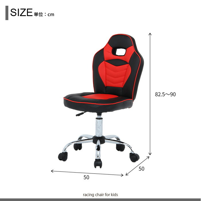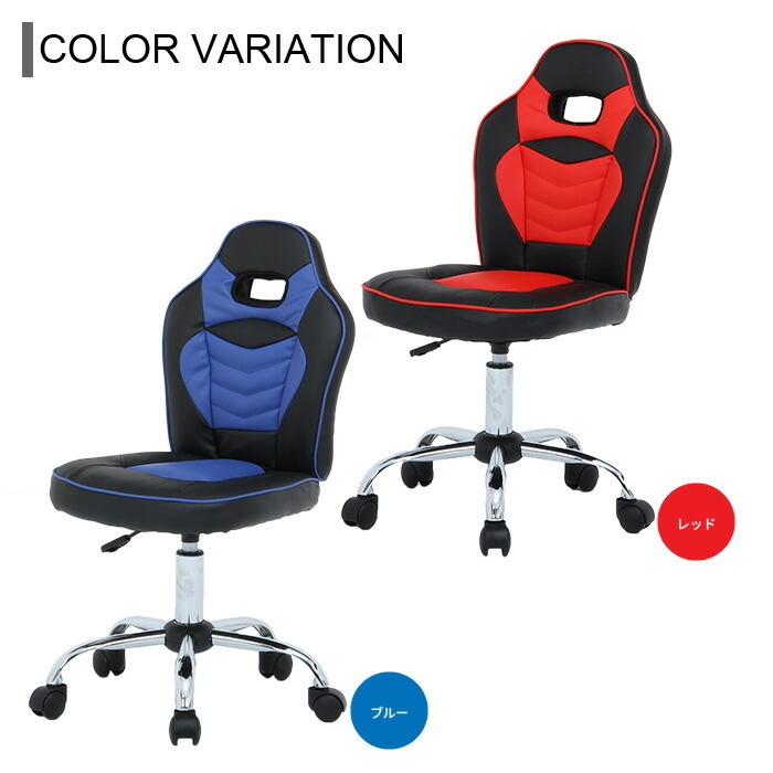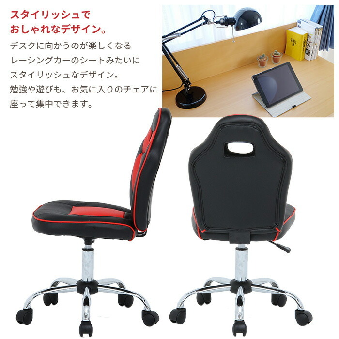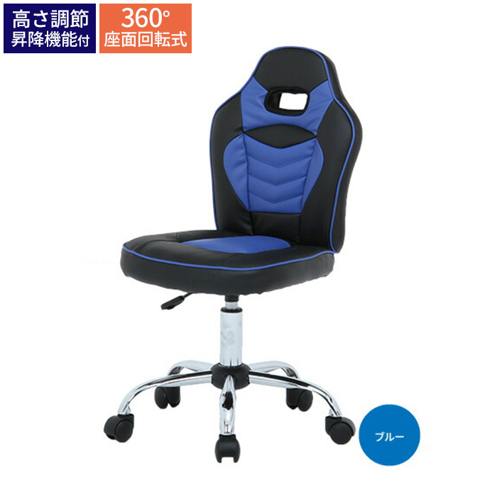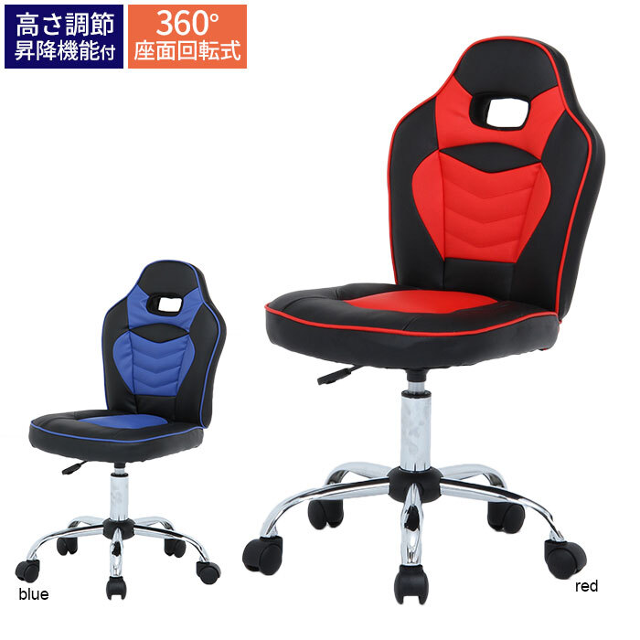 | レーシングカーのシートをイメージしたスタイリッシュなキッズ用チェア。 成長するお子様の身長やデスクに合わせて高さが調節できるガス昇降機能付。 座面は360度回転式で楽に立ち座りできます。 キャスター付きなので、座ったまま移動もラクラク。 張地は合成皮革を使用しているので、汚れてしまってもサッと拭きとるだけでお手入れ簡単。 カラーはレッドとブルーの2色よりお選びいただけます。 |