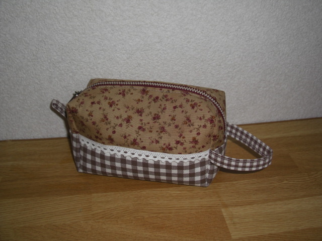★ハンドメイド ポーチ 茶に小花&茶系チェック