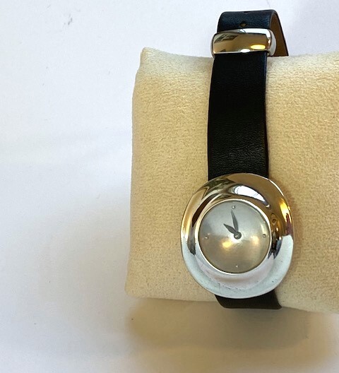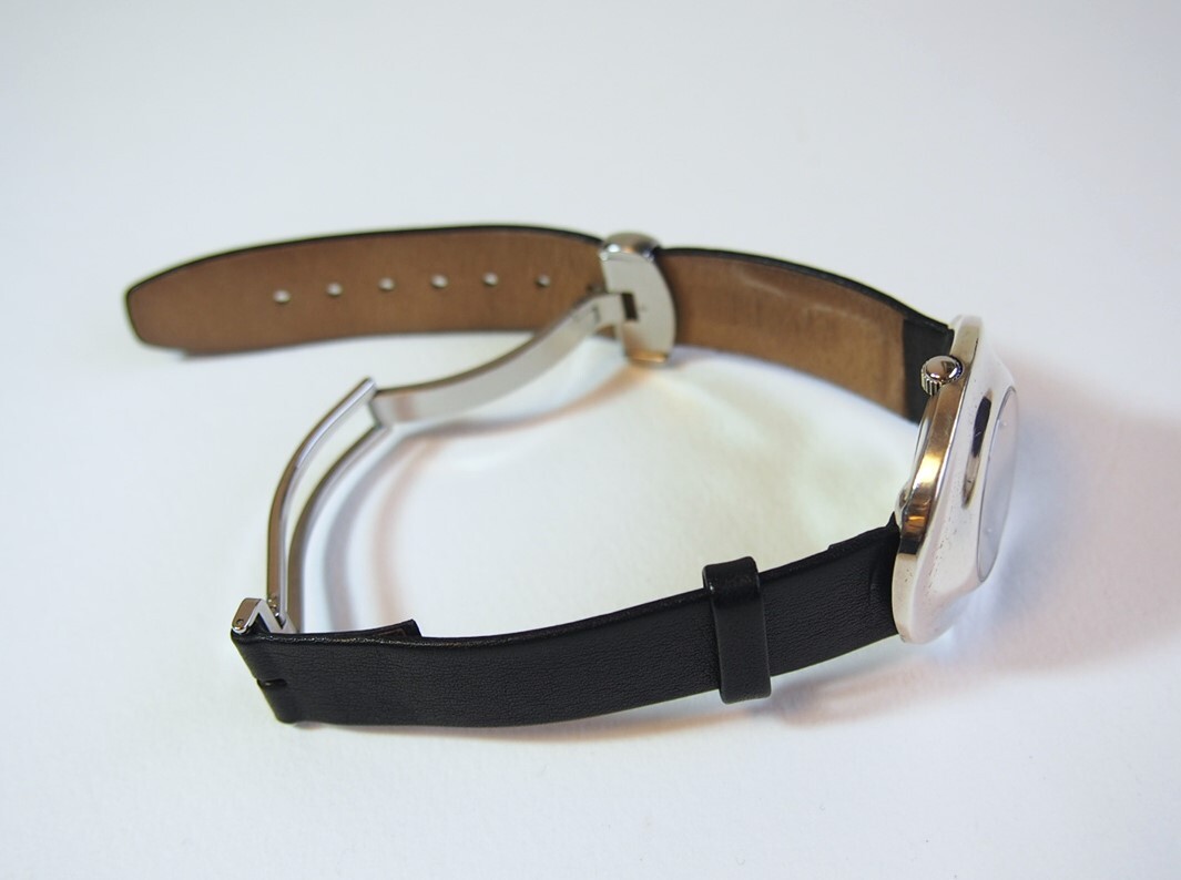 スターリングシルバー925を贅沢に銀無垢で作られた贅沢なジュエリーの様な時計。 アシンメトリーな丸い形が大変エレガントで、大変シンプルな外見でコーディネイトしやすい時計。ワンタッチで着脱できるレザーベルトで実用性も抜群です。