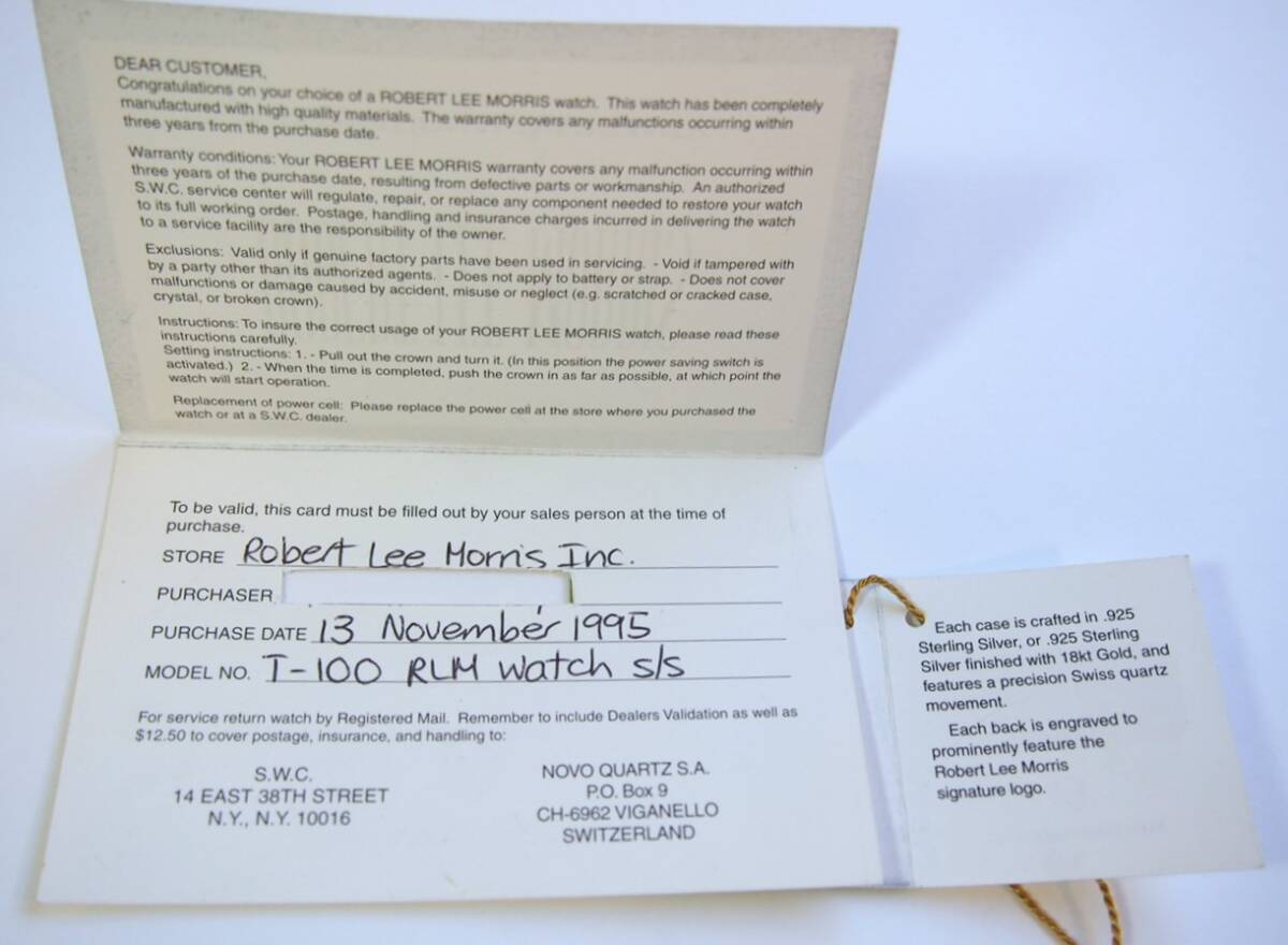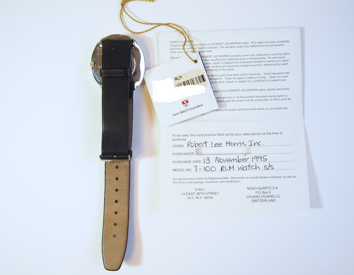 ◆純正ベルト内側、ベルトの金具にもRobert Lee MorrisのロゴとSwiss Watch Corporationのロゴ、スイス製刻印
