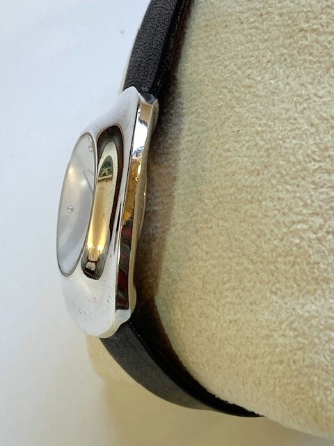 裏面にはブランドロゴ、シルバー925の刻印、スイス製との刻印がございます。ガラスも特にダメージもなく綺麗な状態かと思います。ベルトは柔らかなマットな本革で特筆すべきダメージはなく綺麗な状態です。 内側の着脱用金属製ホールディングバックルも画像の様にブランド銘が刻印。