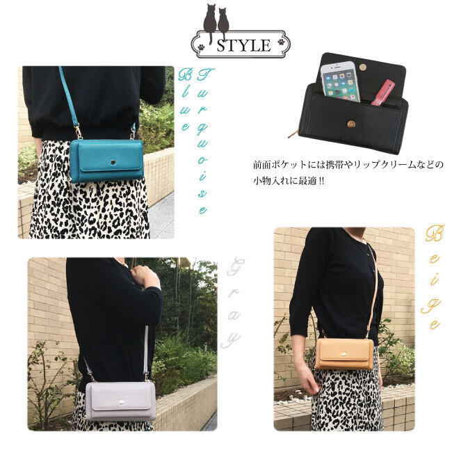 スマホポーチとウォレットが一体化した、猫型金具がかわいい2wayお財布横型ショルダーバッグ。前面のかぶせポケットには、スマホも収納できお出掛けはこれひとつで身軽にお出かけすることが出来ます。ショルダーは、取り外し可能でお財布とショルダーバッグとして2WAYでお使い頂けます! ちょっとそこまでのお出かけやお散歩にもぴったりなサイズ感♪
