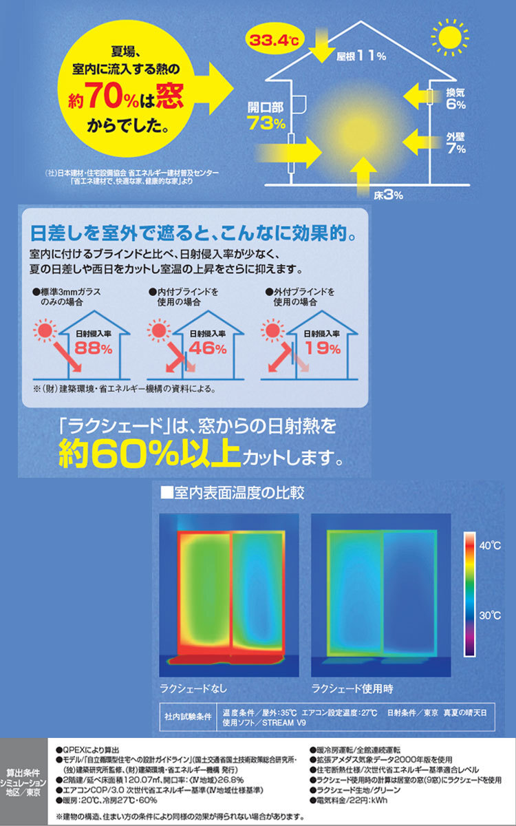 外部からの日射熱を効率よく覆う事で、室内の温度上昇を抑え、電気の使用量を減らす事ができ、冷房費の節約になります。 >>取扱説明書裏面(2ページ目)をみる