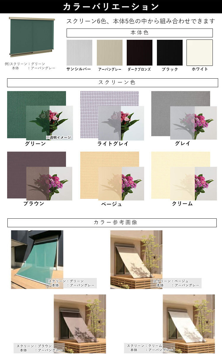 スクリーン(布部)色は、ご自宅の外壁色に合わせて豊富な6色よりお選び頂けます。