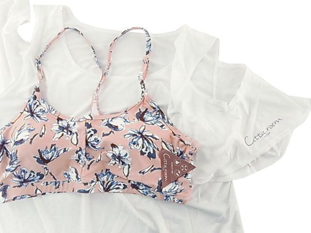 フレア袖とプリーツボトムで気になる体型をカバーしつつ適度に肌見せするショルダーポイントが魅力☆様々な着こなしができる citta room レギンス付き 水陸両用レディース水着4点セット (M)。