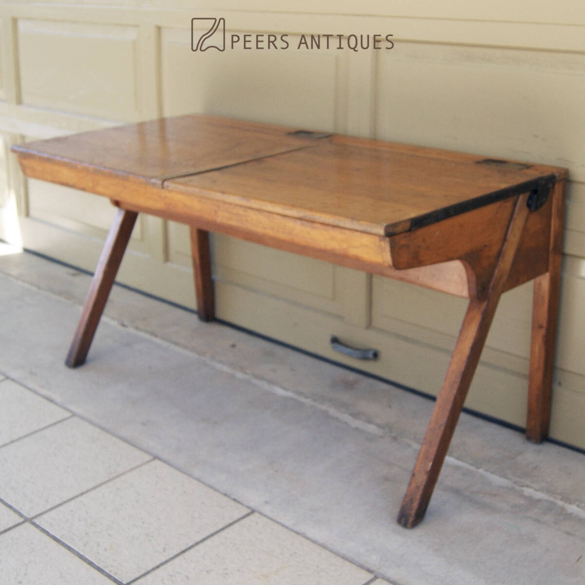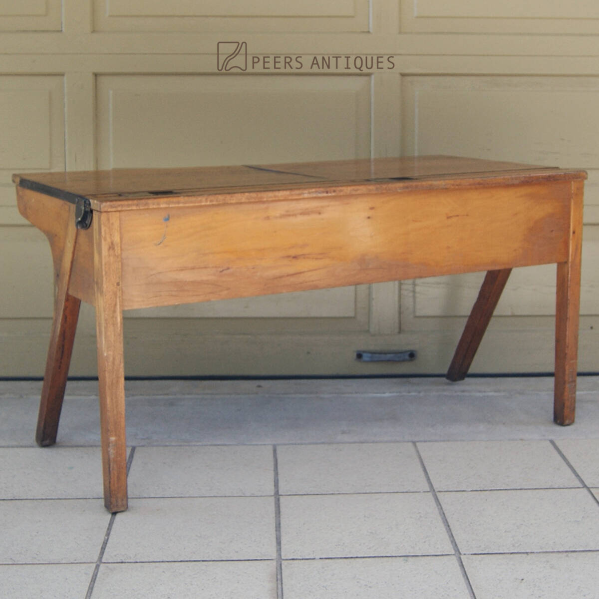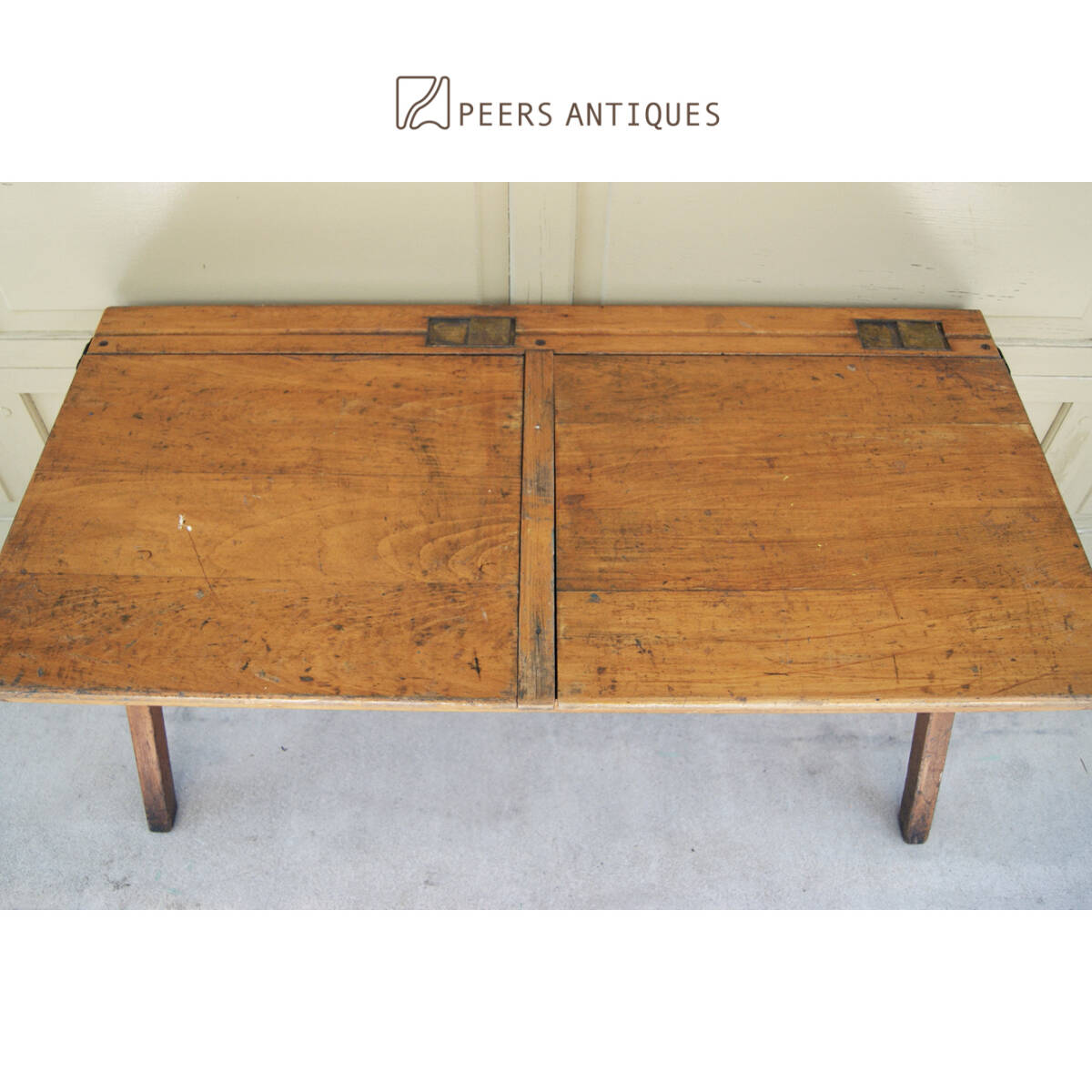 4445t18【イギリス 英国 アンティーク☆古い 木製 2人掛け スクールデスク 学校机】ローテーブル 飾台 展示台 ヴィンテージ 希少 レア◎