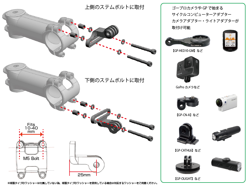 ステムのクランプボルトとして直接固定するマウント・ M5ボルトサイズで CC 10mm-40mmまでの間隔に対応の汎用タイプ