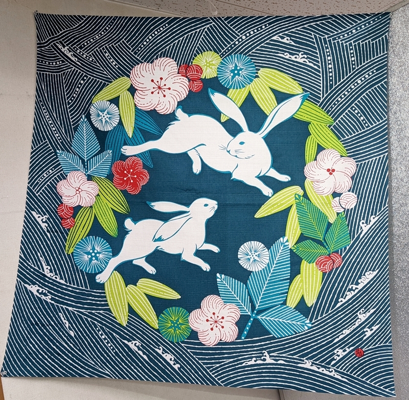 ・柄:さんざめく波 吉祥を運ぶ ・素材:綿100% 落ち着いた色目ながら、印象的な意匠で毎年大人気な干支柄風呂敷です 2023年は「卯」 うさぎは長寿・吉祥文様、女性の守護といった意味があり、干支関係なく年中使いやすい柄です |