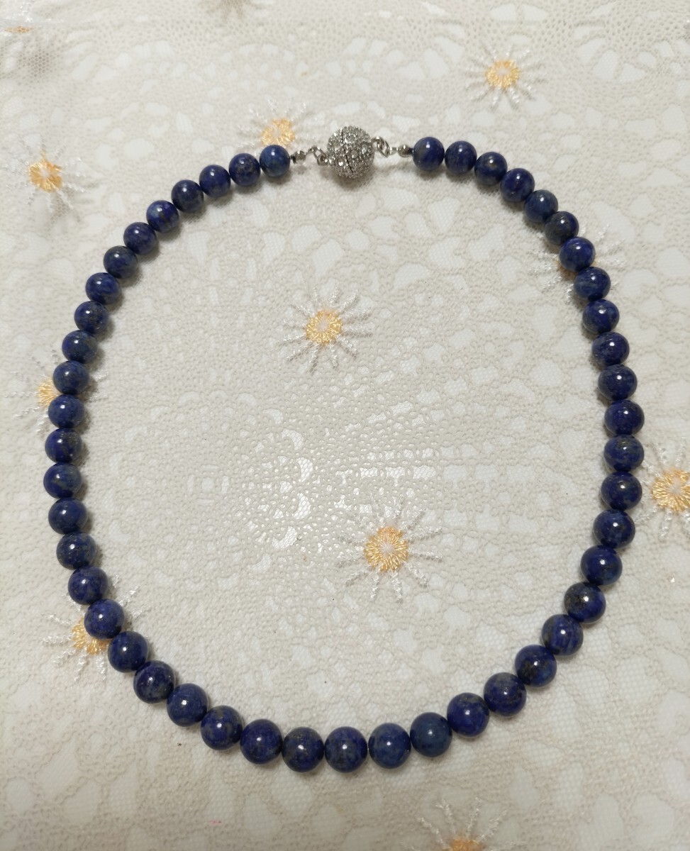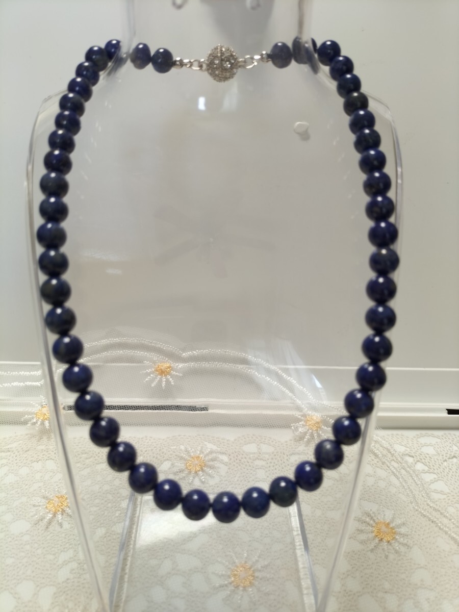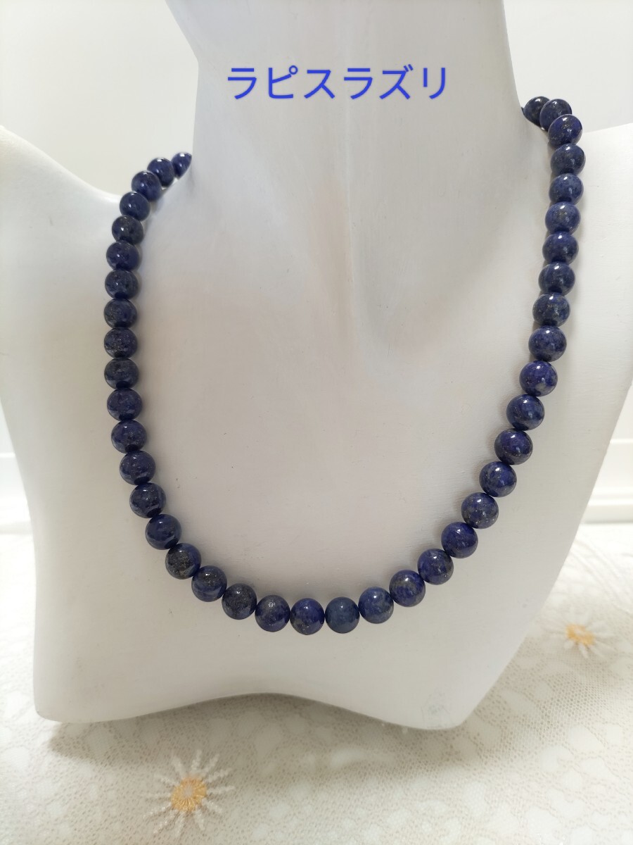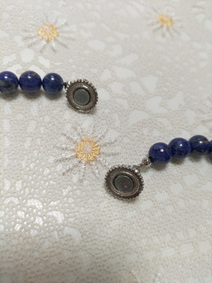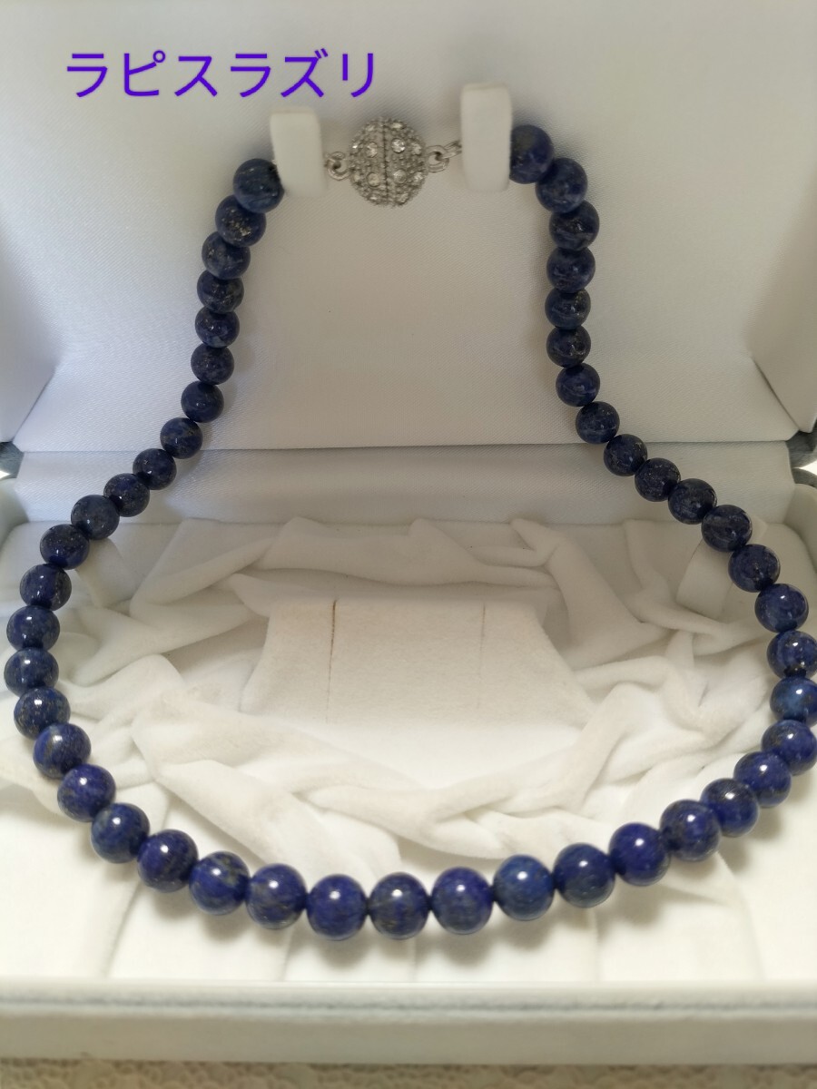こちらは、天然無着色 ラピスラズリ ラウンド 8mm珠のマグネット式のネックレスでございます。