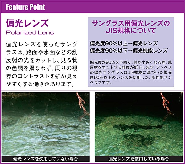 | PANORAMIC VIEW LENS パノラミックビューレンズ サイドピラーを取りはらい180°以上の広角視界を実現。 幅広のメガネが入るように設計されているので市販のメガネの上から無理なく使用できます。 POLARIZED LENS 偏光レンズ 偏光レンズは視界の色調を損なうことなくコントラストを強め、路面や水面、雪原からの乱反射をカットしクールな視界が得られます。 UV-400 UV-400カットレンズ 世界で最もUV基準が厳しいと言われるオーストラリアの基準をパスしたUV-400対応のレンズです。目に有害な紫外線やブルー光線をカットします。 GRILAMID FRAME 超弾性樹脂フレームの特徴 軽量で衝撃に強くしなやかなフィット感の秘密はフレームの構造と素材にあります。その素材はグリルアミドというナイロン樹脂で、曲げ弾性、バネフィット性、耐薬品性、-40度から120度までの耐温度性などに優れているのが特徴です。スポーツグラスのフレームに求められる条件に対して、その優れた特徴を活かしたフレームのサイズ、デザインが計算されています。 FLEXIBLE RUBBER TEMPLE フレキシブルラバーテンプル 個々の骨格にフィットする最適な角度やカーブを微妙に調節することができます。 |