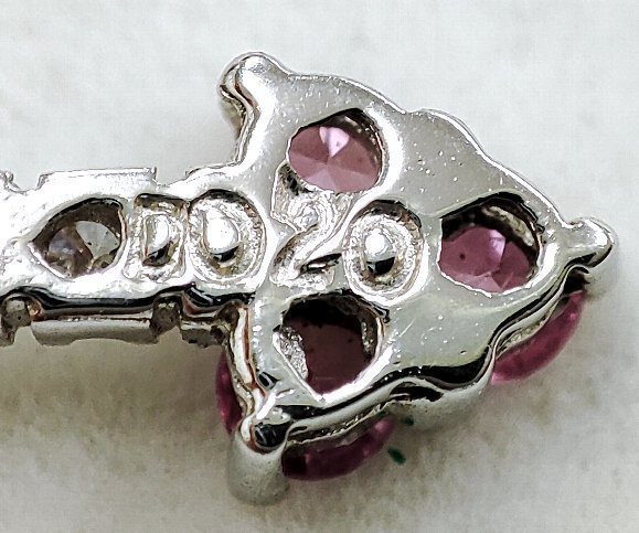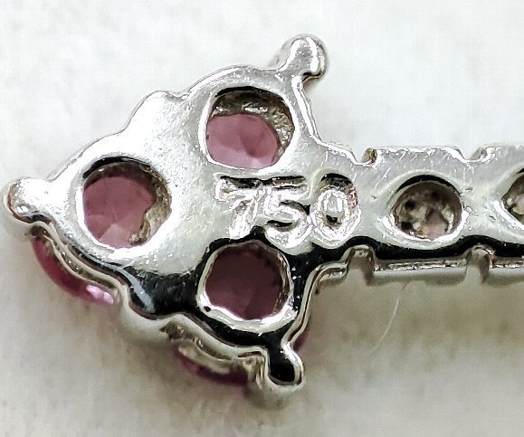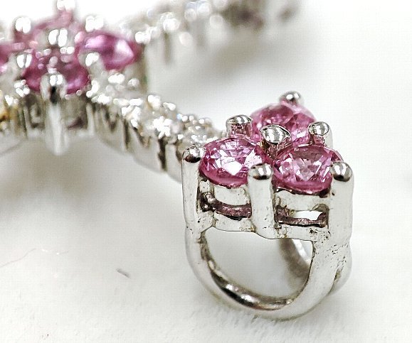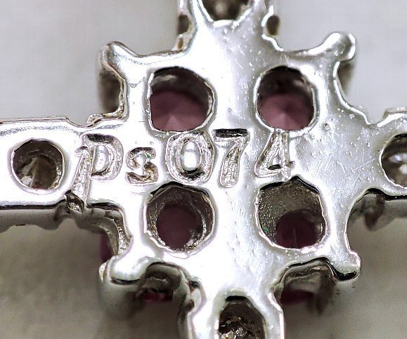 クロスをモチーフに模られたペンダントトップです。クロスの各端と中心に 合計、0.72カラットの天然ピンクサファイアがセットされており天然メレダイヤモンドとのコントラストが印象的です。 ペンダントトップの縦サイズは 31ミリ有り、素材は 18金ホワイトゴールドを使用してます。ネックレスの通る部分の内径は 約2.5ミリです。 ピンクサファイアは 透明感も有り輝きは強く大変綺麗です。ダイヤモンドのクラリティは主観になりますが、SIクラスからIクラスになるかと思います。輝きは強く綺麗です。 |