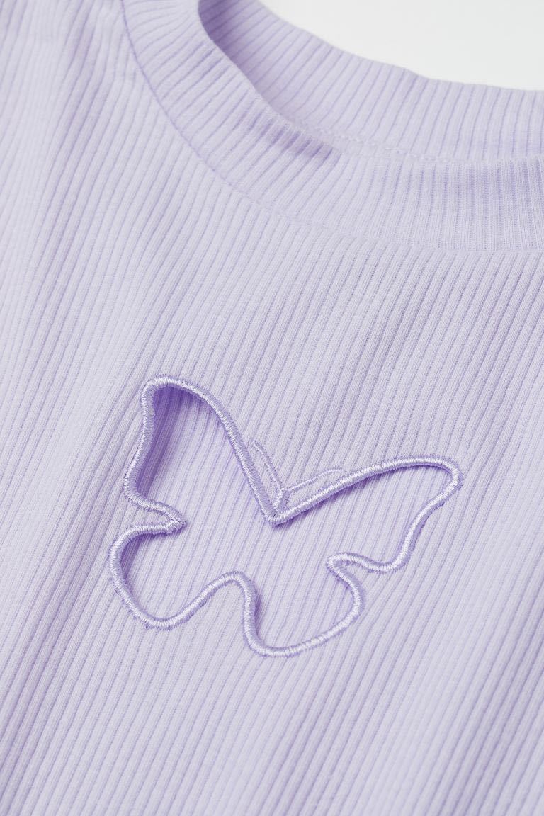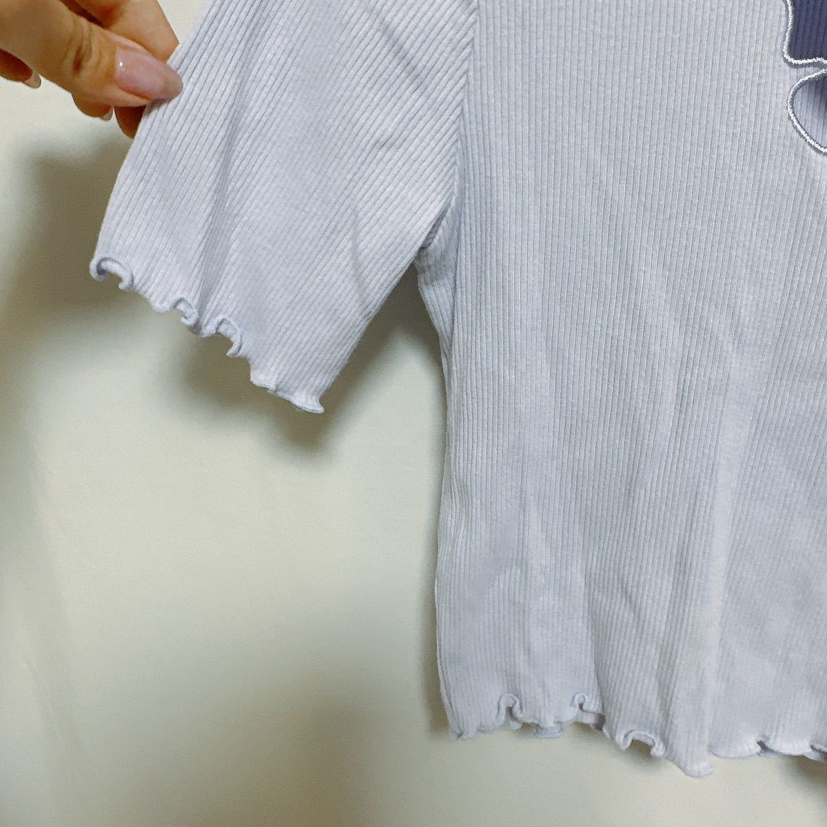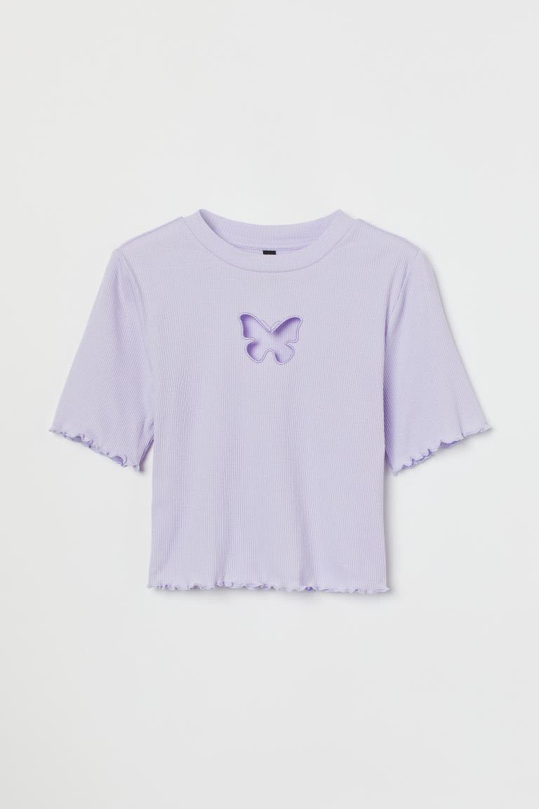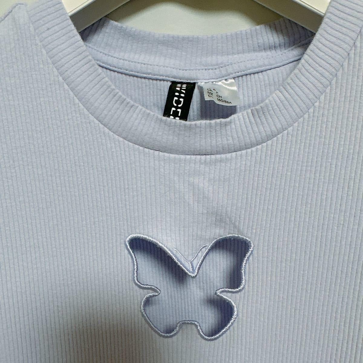 コットンのリブジャージー素材を使用したクロップドトップス。胸元にバタフライの形の小さなカットアウトが入ったデザイン。半袖。袖口と裾はオーバーロック仕上げ。