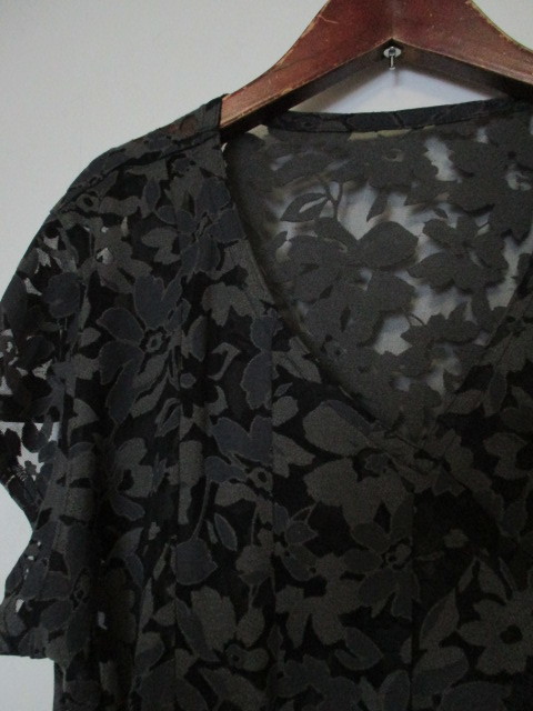 | 商品紹介 | 花模様がオシャレな半袖チュニックです。 エリはVネックになっています。 パッと見、わかりづらいですが、 前のみ切替えのタックが入っています。 本体部分は黒で透け感があり、花模様部分は 濃淡のあるグレーです。 《素材》 レーヨン71% ポリエステル29% |