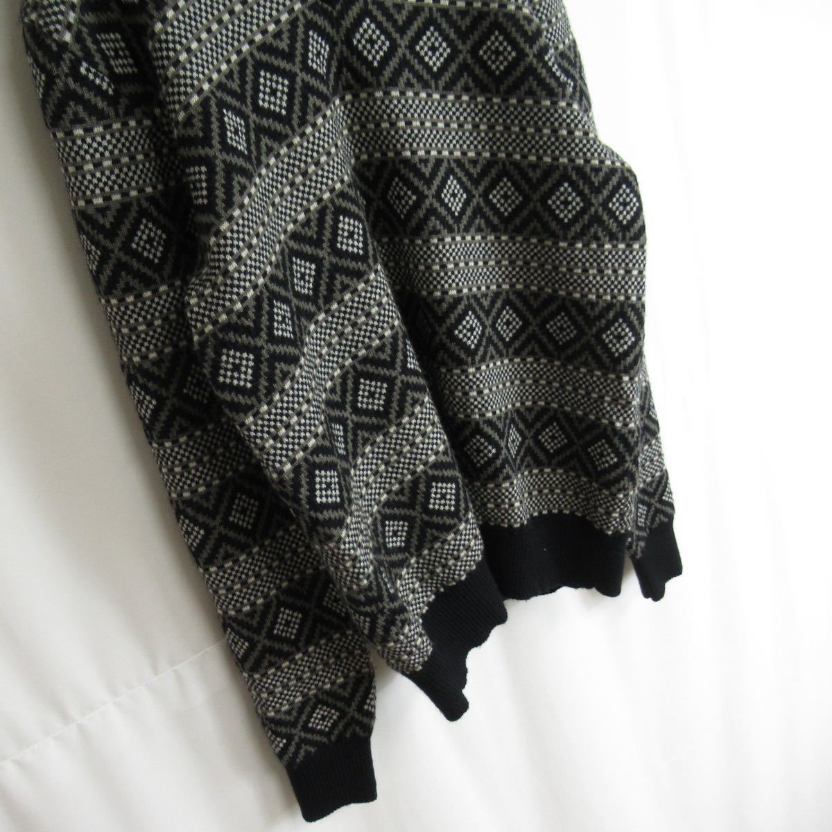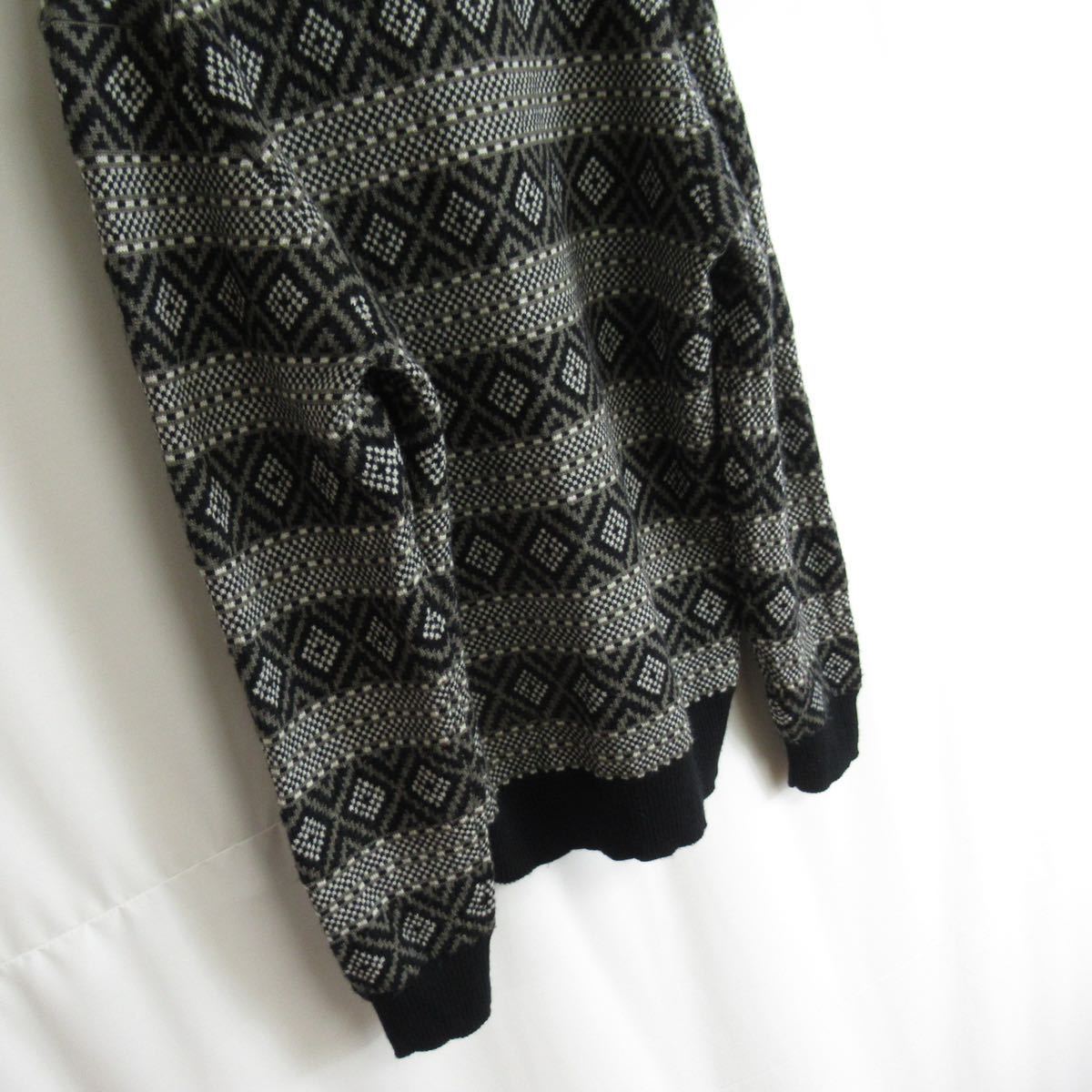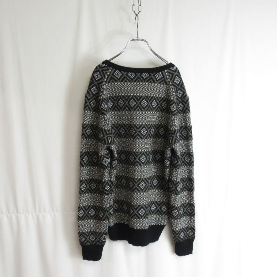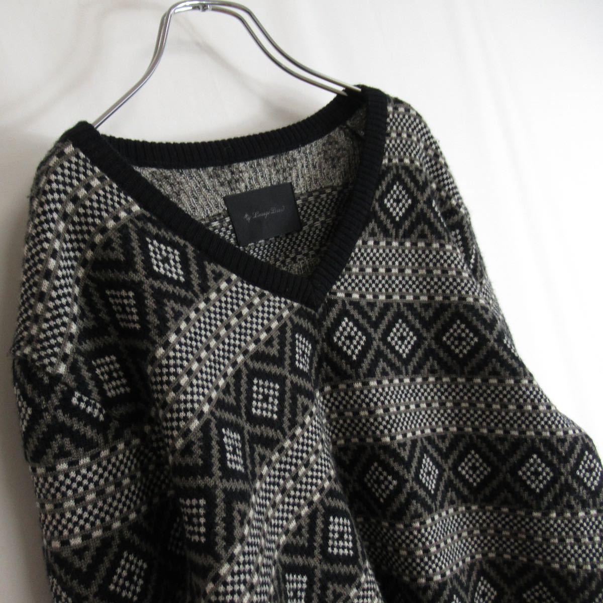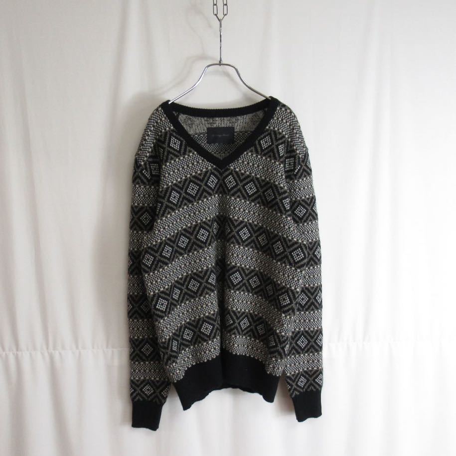 LOUNGE LIZARD 【 ラウンジ リザード 】 の Vネック ニット セーター です。上質なウール100%ニットの風合いとネイティブ調の総柄デザインが洒脱な一着。シャツとレイヤードやジャケットのインナー等、様々な組み合わせで活躍してくれます。春秋冬と3シーズン着用可能。お探しの方は是非ご検討下さい。