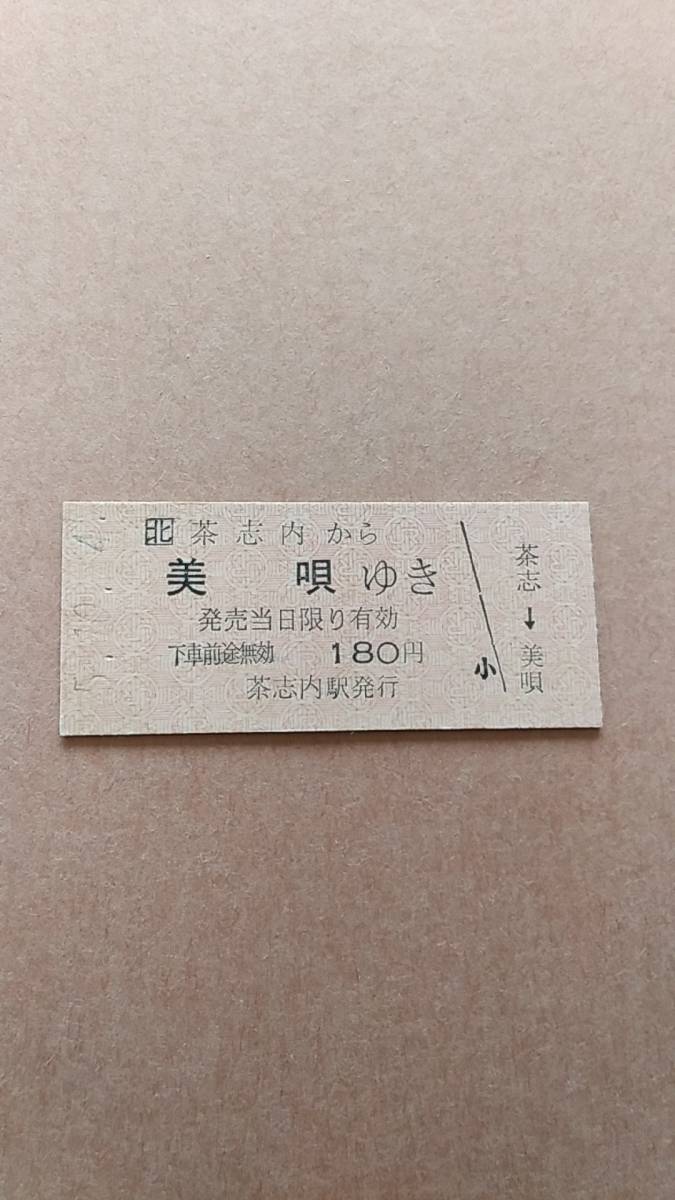 JR北海道 函館本線 茶志内から美唄ゆき 180円 茶志内駅発行