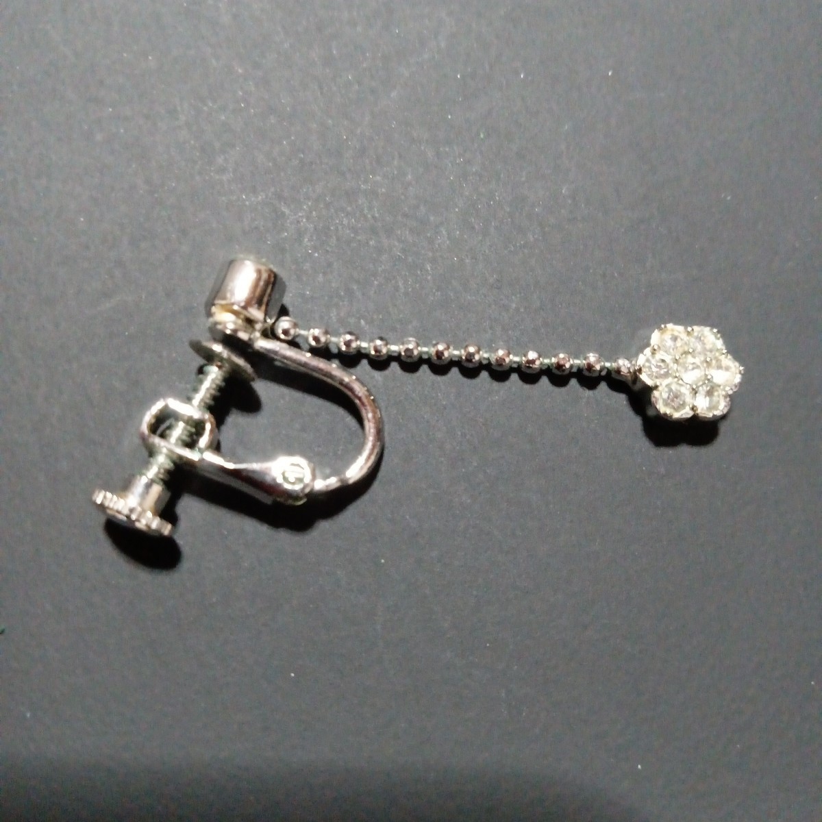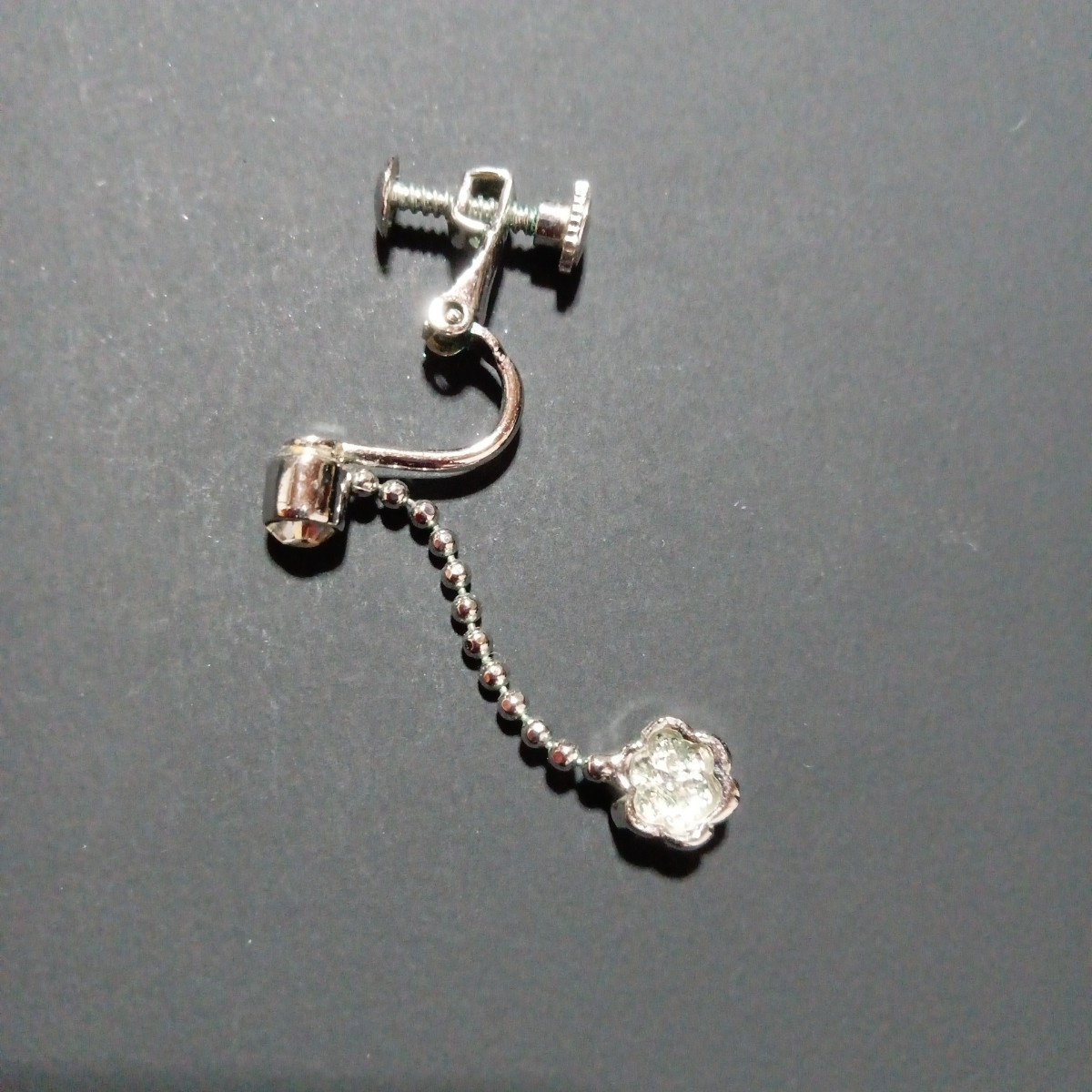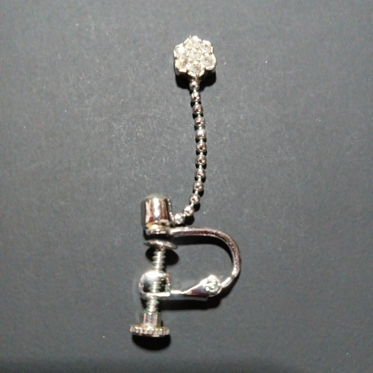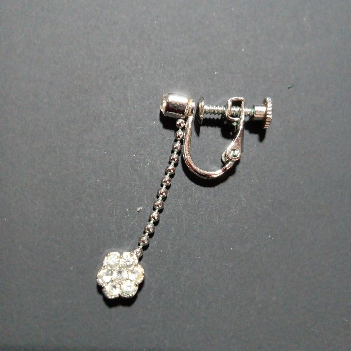 ボールチェーンの先に、小さなお花のモチーフが揺れる素敵なスイングイヤリングです。金具の部分に一粒と、お花の片面全体に施された、ラインストーンがキラキラ輝いて綺麗です。