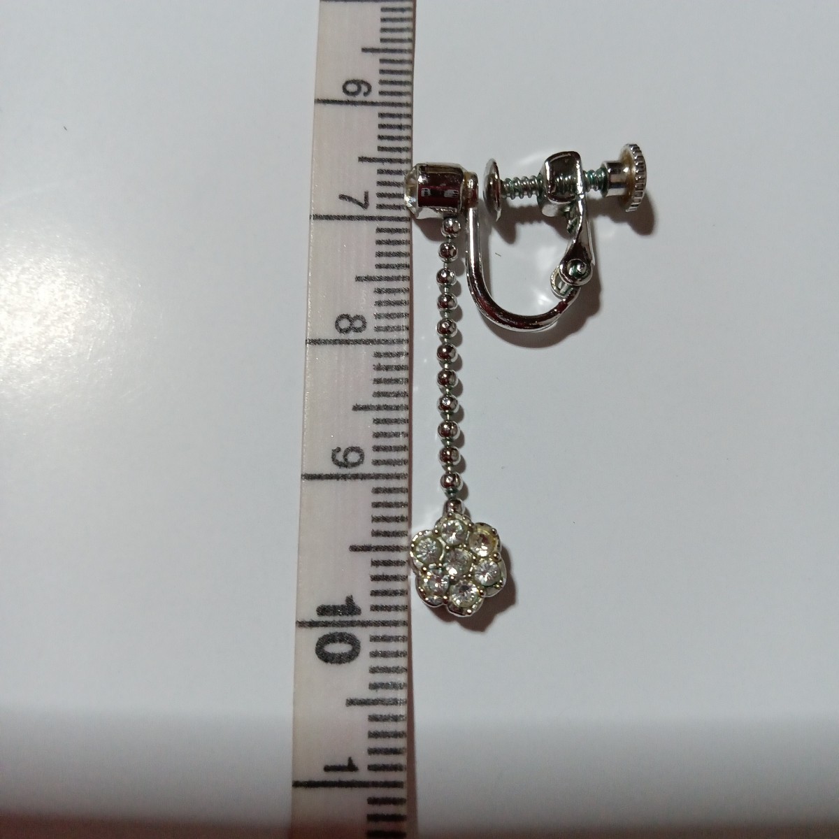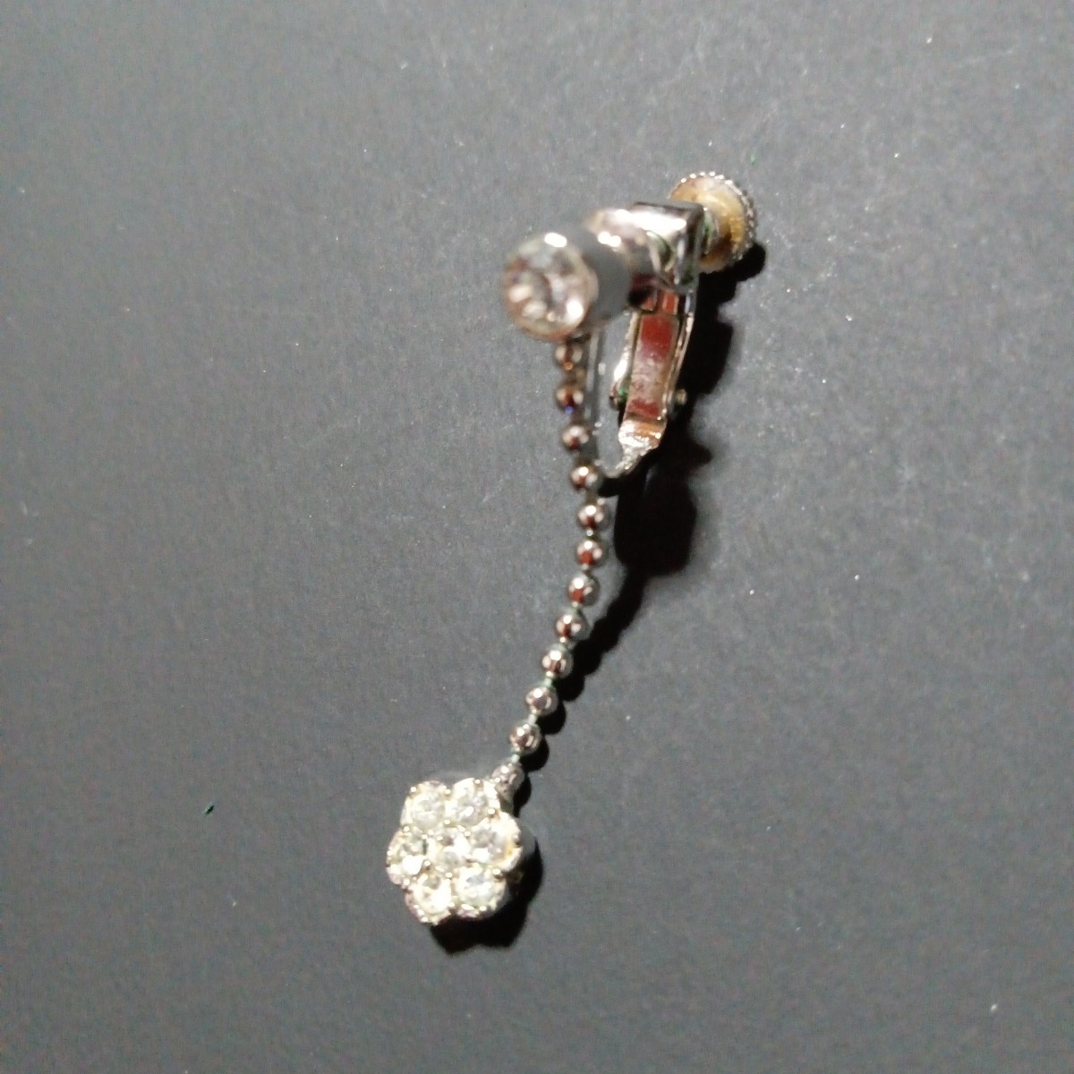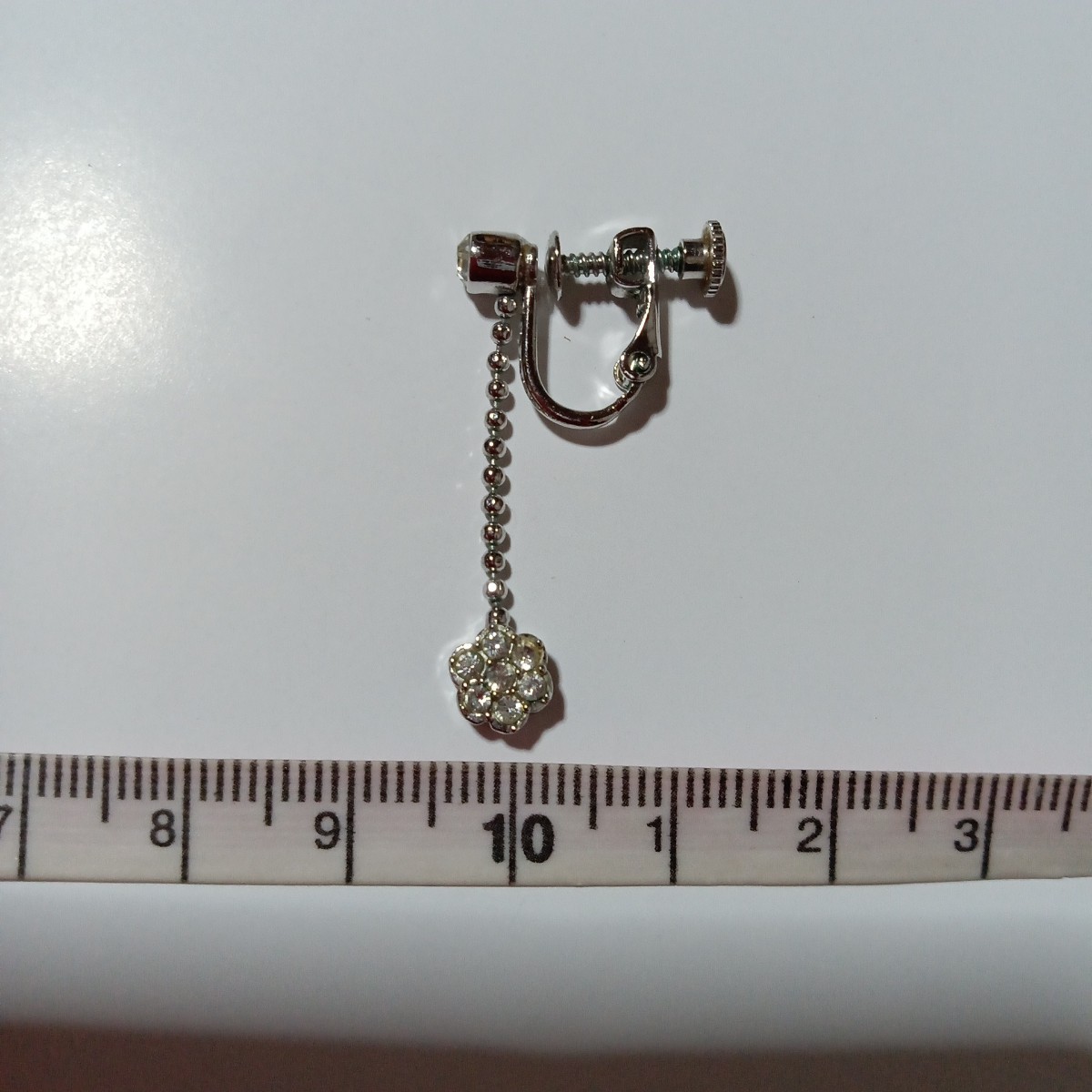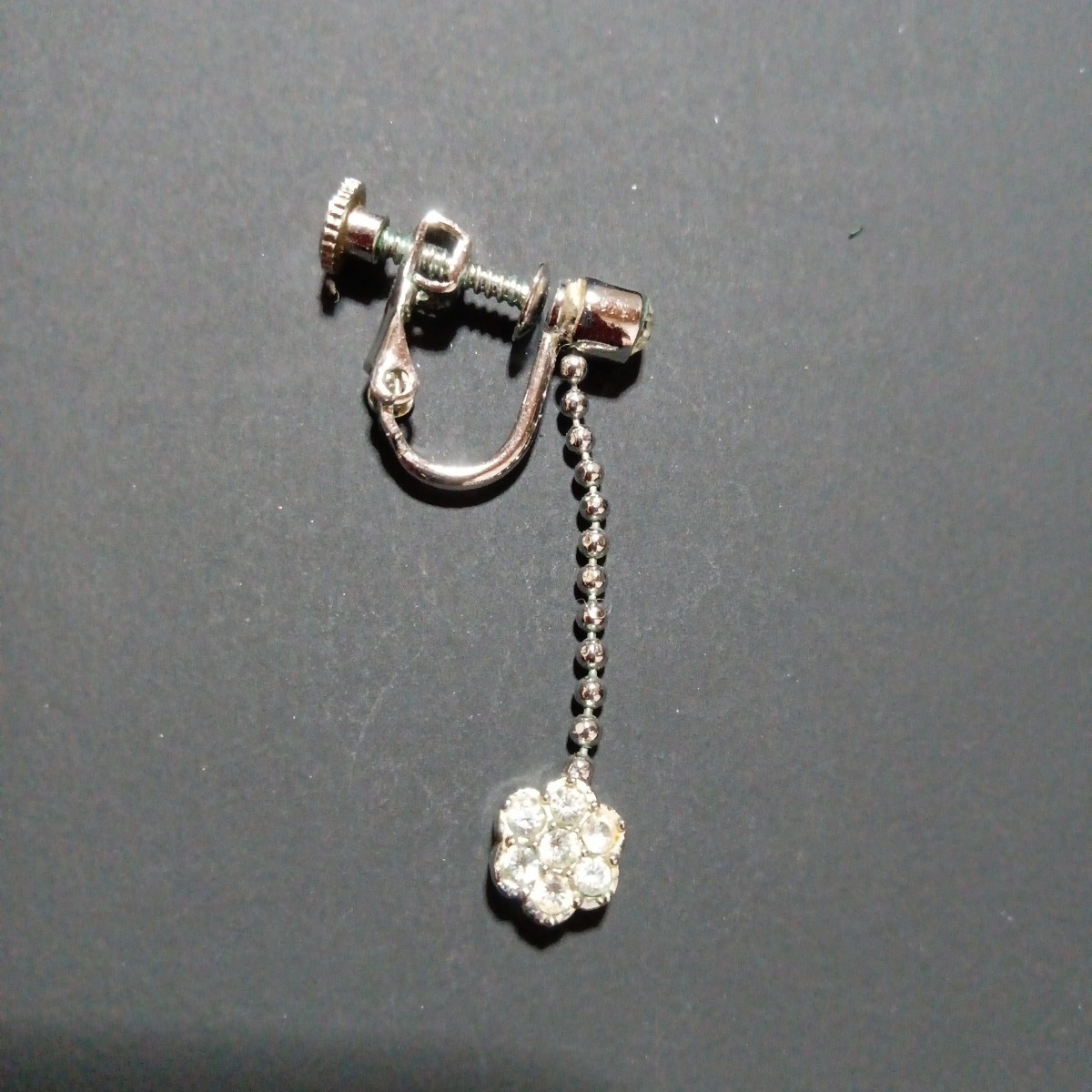 ボールチェーンの先に、小さなお花のモチーフが揺れる素敵なスイングイヤリングです。金具の部分に一粒と、お花の片面全体に施された、ラインストーンがキラキラ輝いて綺麗です。
