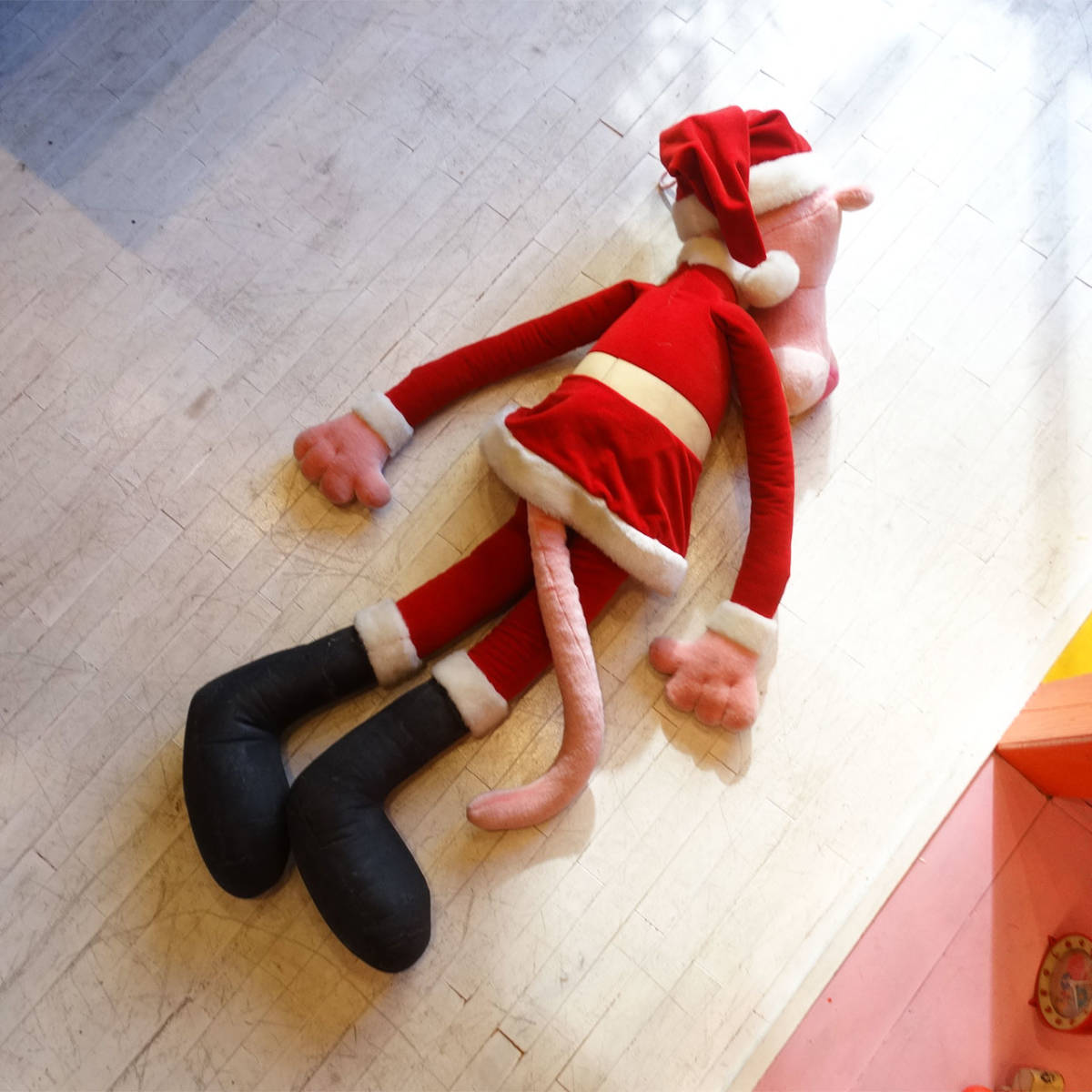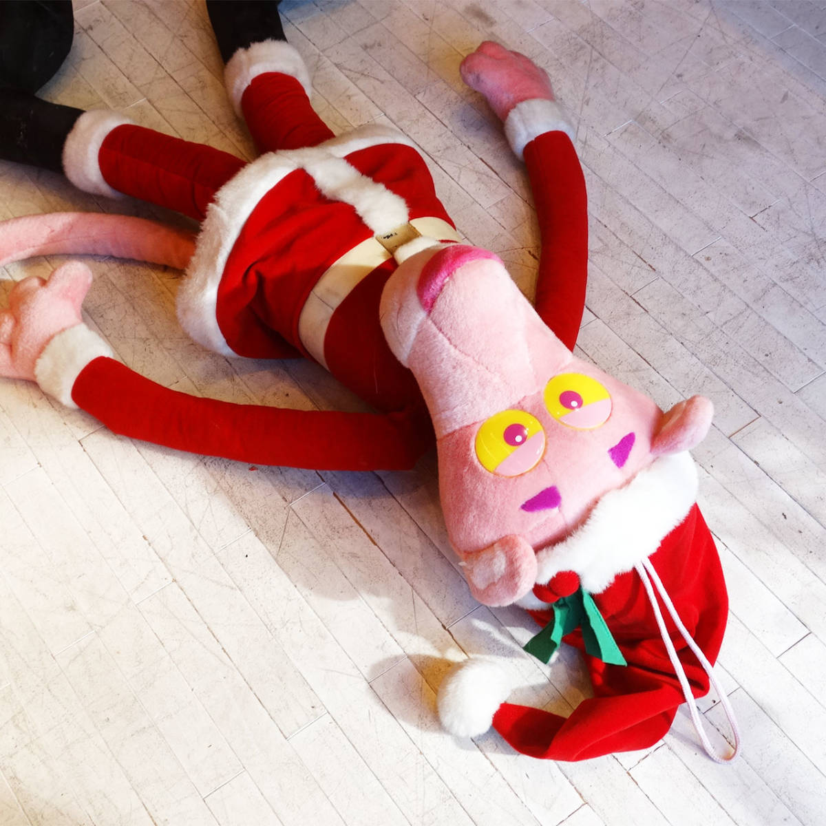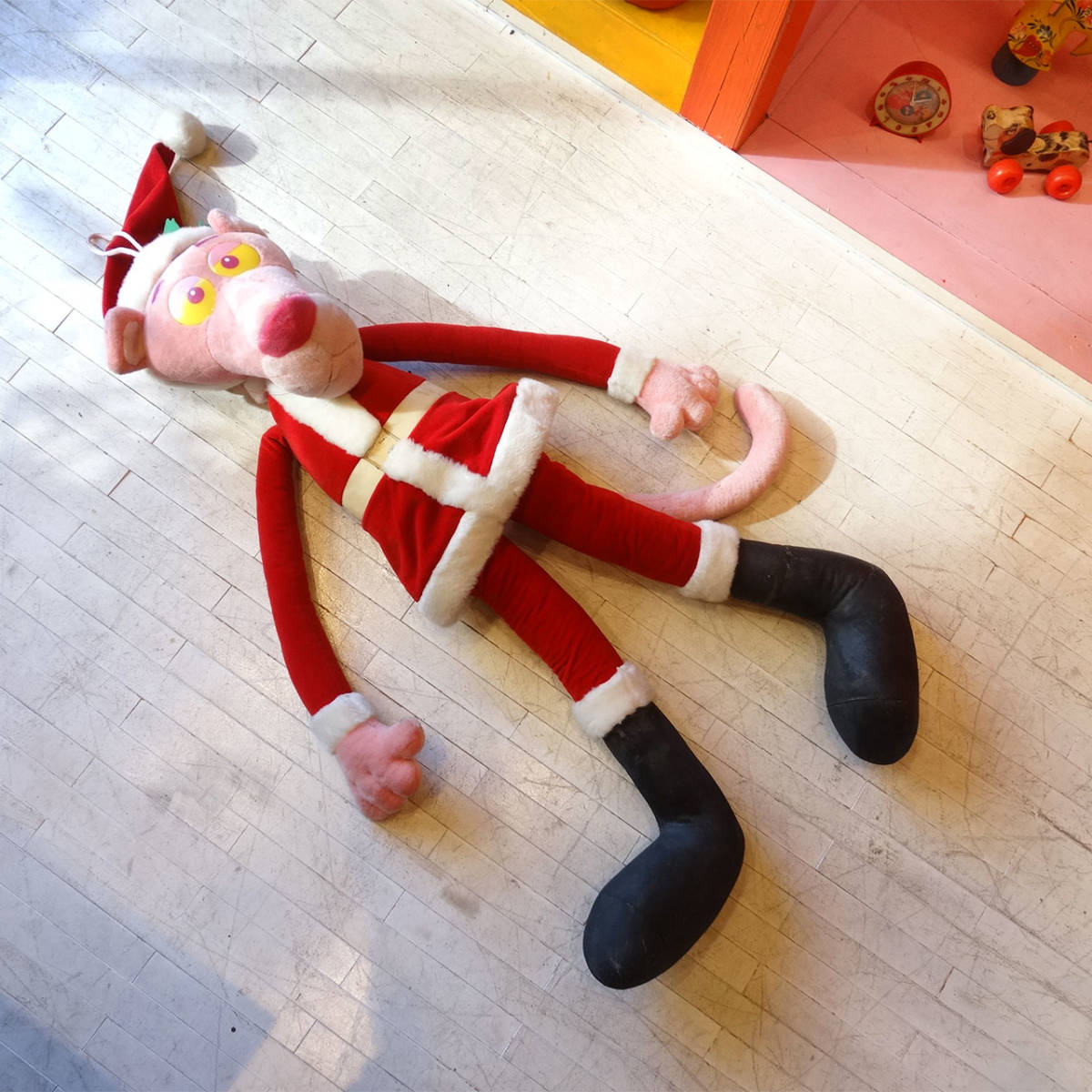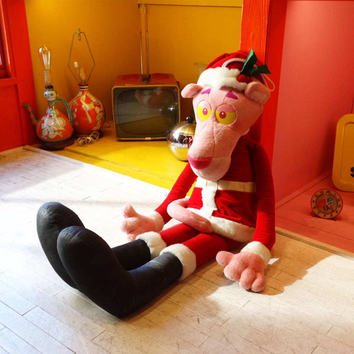 サンタの恰好をしたビッグサイズのピンクパンサーの人形でございます。
