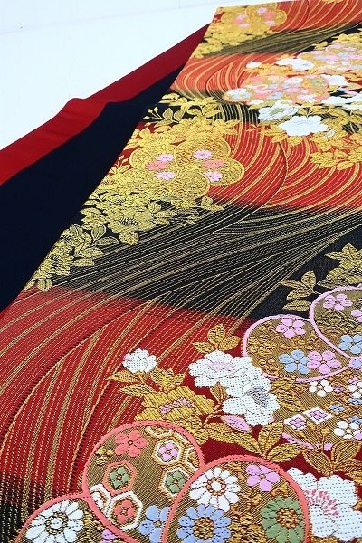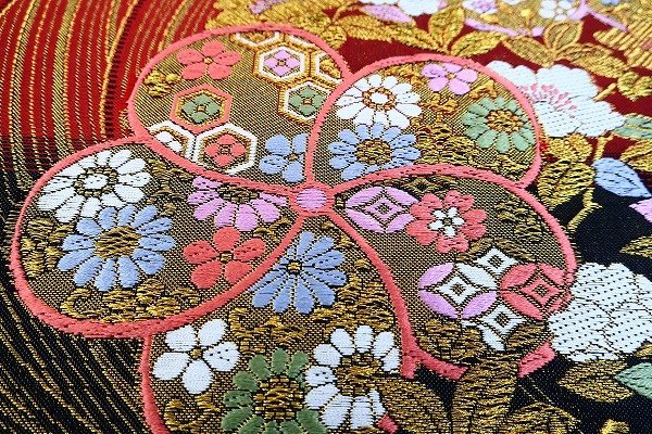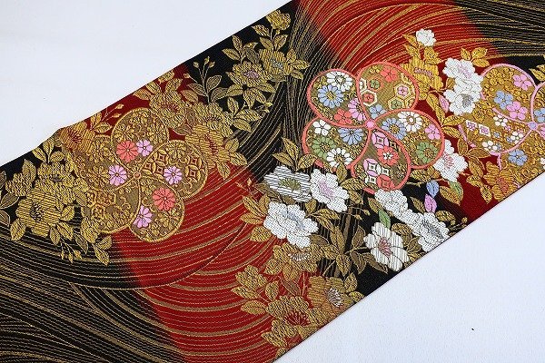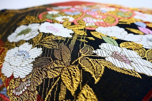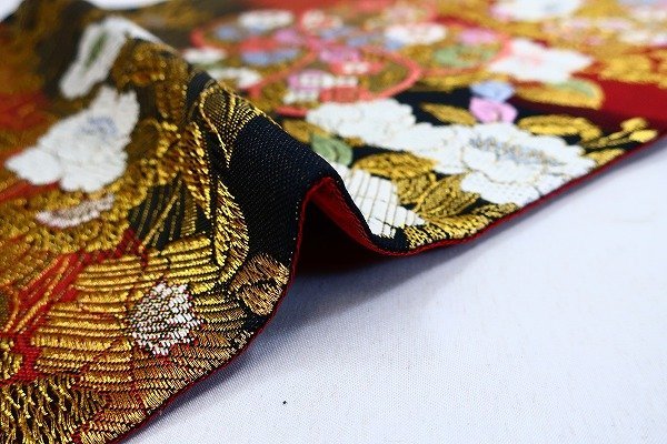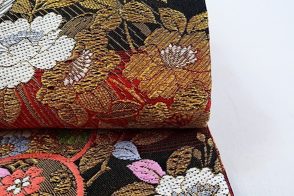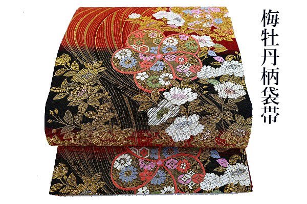【着物フィ】袋帯 黒 赤茶色 金糸 梅 牡丹 六通柄 豪華 振袖 仕立て上がり 長さ4m51cm 正絹 お洒落 m-5412 |