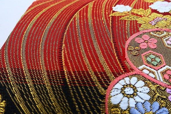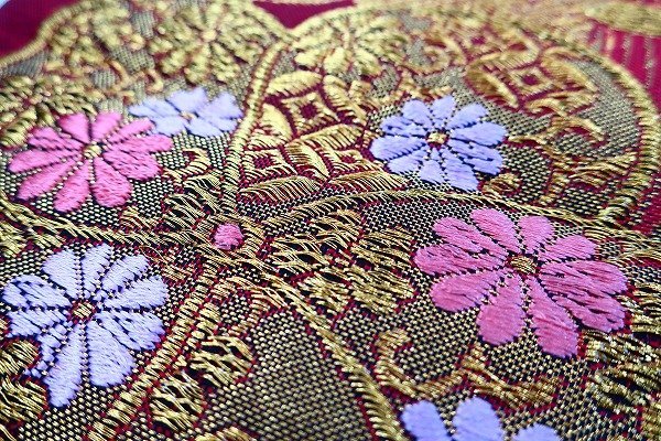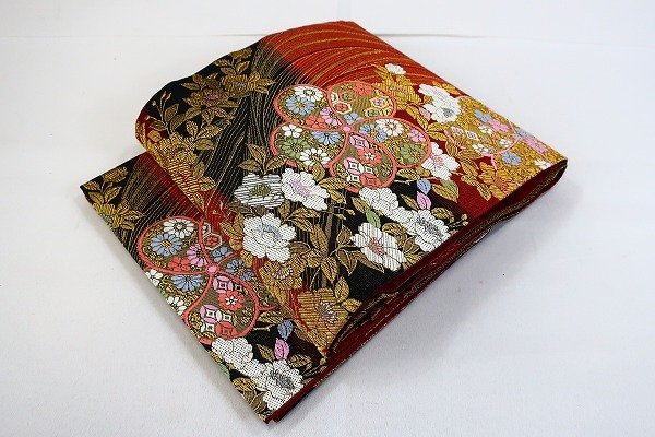 黒と赤茶色の織分け地に金糸で梅や牡丹が織り込まれた袋帯です。 金糸がキラキラと輝いて綺麗なお品です。 担当:伊藤 |