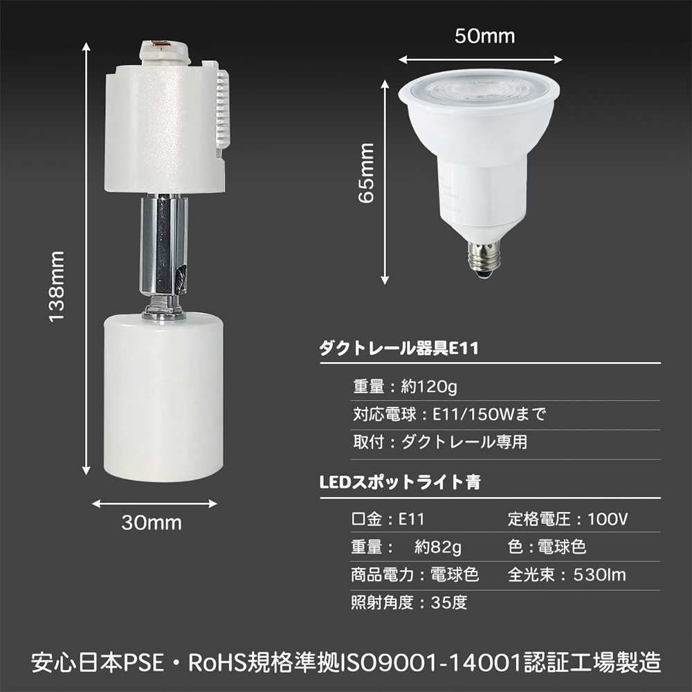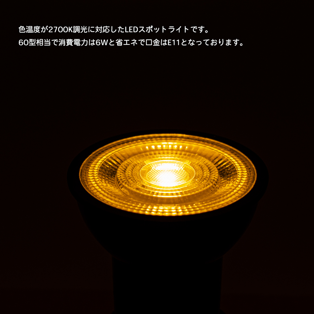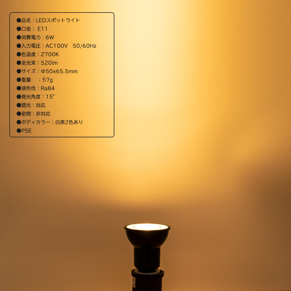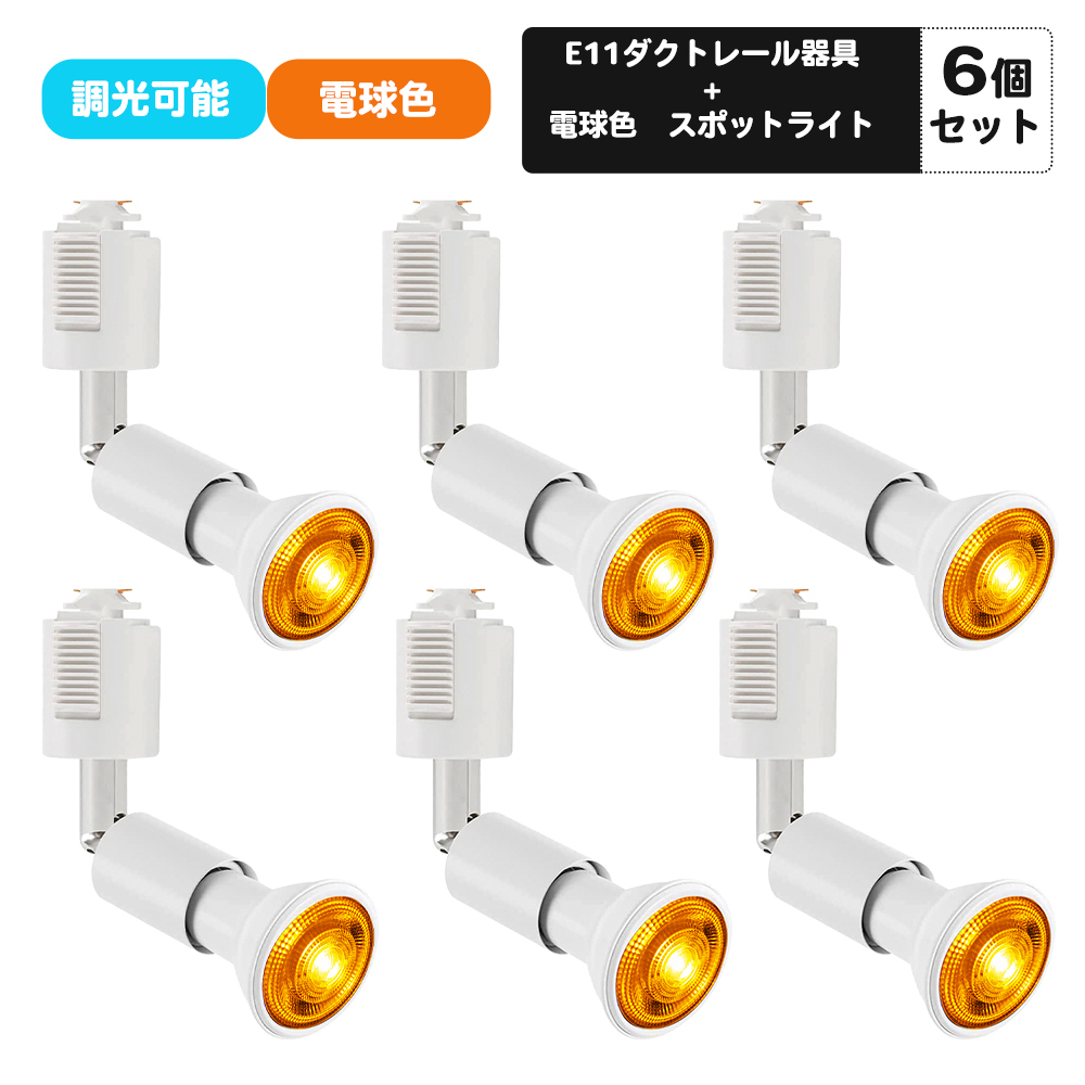 6個セット【商品の特徴】■集光タイプ・即点灯:照射角度は35°で光線が更に集中、照らされた物が色鮮やかになったり、美しさを引き出します。商業照明の看板照明、ジュエリーの展示照明などに活躍しています。家庭照明にもよく使われ、特にダクトレールライトとダウンライトに最適です。スイッチを入れた瞬間に明るく点灯します。それに、紫外線と赤外線はほとんど出ないので、虫が寄りにくい。■高演色性・長寿命:スポットライトの演色性はRa80以上に達し、物の本当の色を自然で綺麗に再現できます。寿命は一般ハロゲン電球の約40倍、長持ちで取替えが大変な場所にお勧めします。帰省時両親のプレゼントに、トイレ、浴室、キッチンなど切れたら困る場所に最適。■取付け簡単:スポットライトは標準E11口金なので、従来のハロゲン電球に直接取替えられ、照明器具を替えることなくご使用いただけます。殆どのE11器具に適用します。放熱性が優れていますので密閉形器具にも使用可能。日本PSE認証済み。【商品仕様】LEDスポットライト●口金:E11●発光色:電球色(2700K)●色温度:530nm●消費電力:6w●口金:E11●サイズ:Φ50x65mm●本体質量:約57g●発光角度:35°●演色性:Ra80以上●PSE・RoHS規格準拠●ISO9001-14001認証工場製造ダクトレール器具●種類:E11レールライト器具●口金:E11●電圧:AC100V●重量:122g●サイズ:全長:138mm、最大径:30mm●上下方向可動:90°●回転方向可動:360°●耐荷重量:5kgまで●備考:安心日本PSE・RoHS規格準拠●高難燃性規格 :V-0取得●自己鎮火作用【注意事項】・実物に近い色を画像で表現していますが、撮影環境、お使いのディスプレイなどの条件によって多少の誤差が生じる場合がございます。・商品のデザイン・仕様は改善のため、入荷のタイミングにより予告なく変更する場合がございます。ご了承ください。LEDを中心にギフト商品を扱っております。