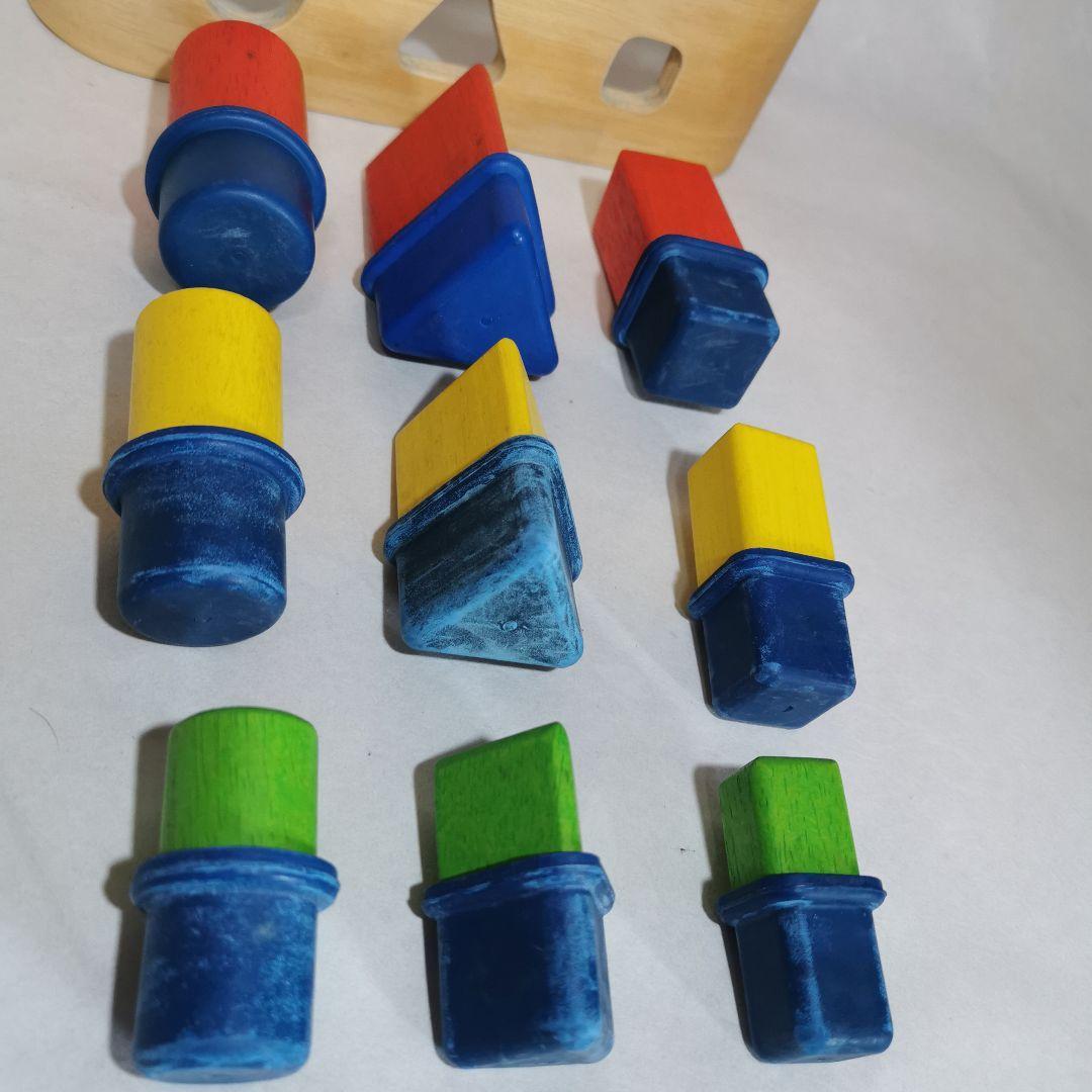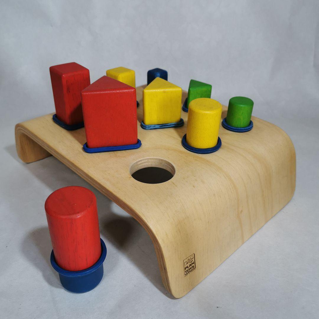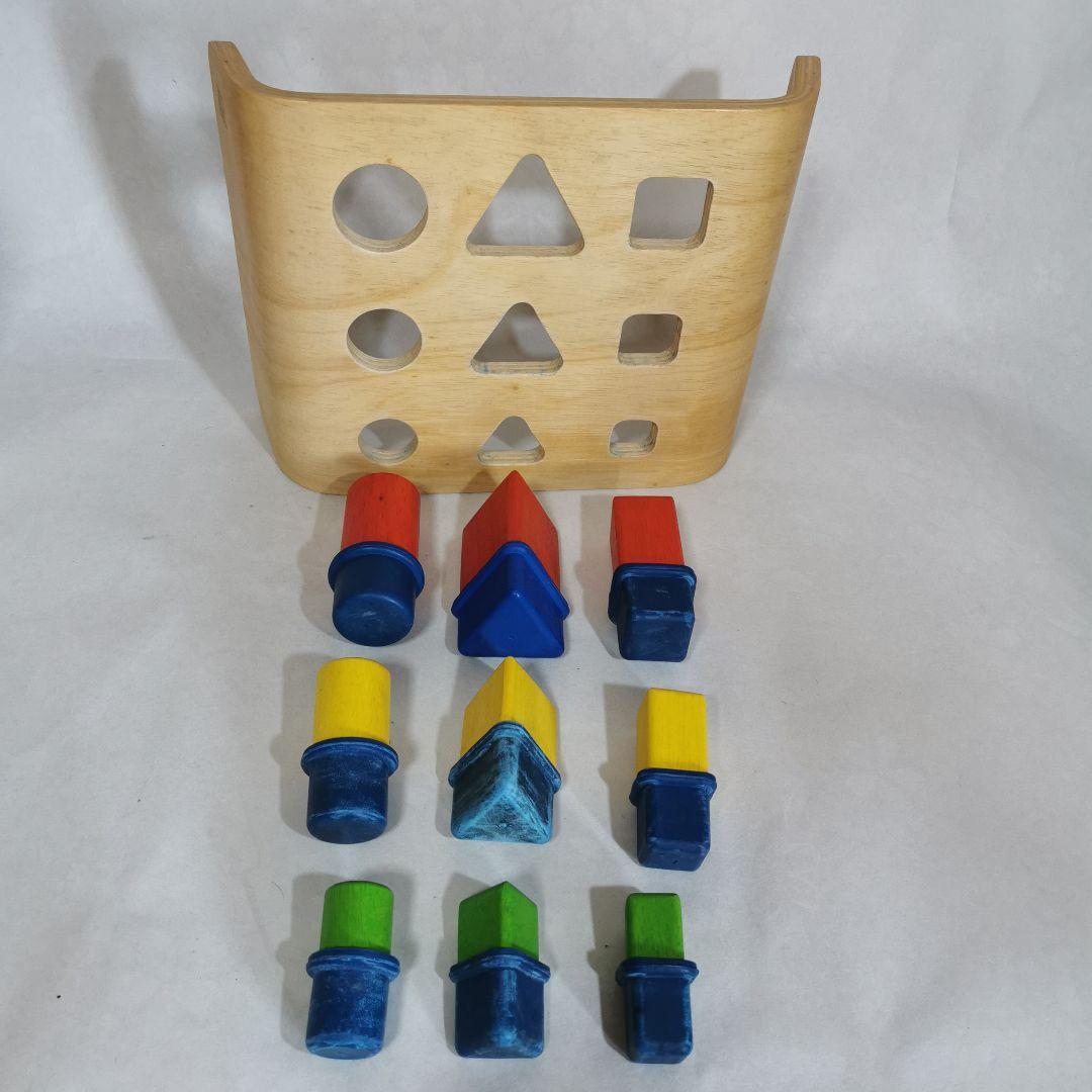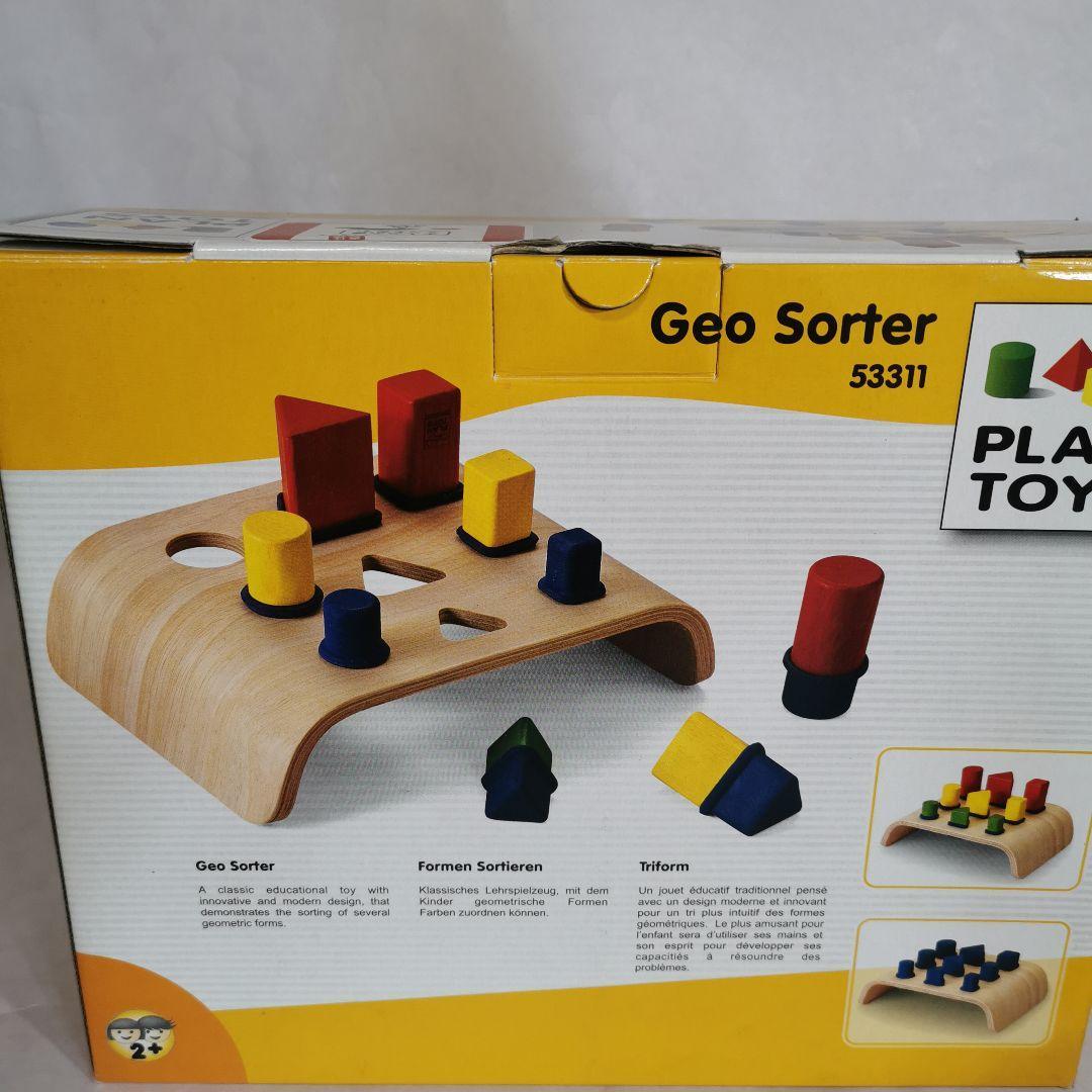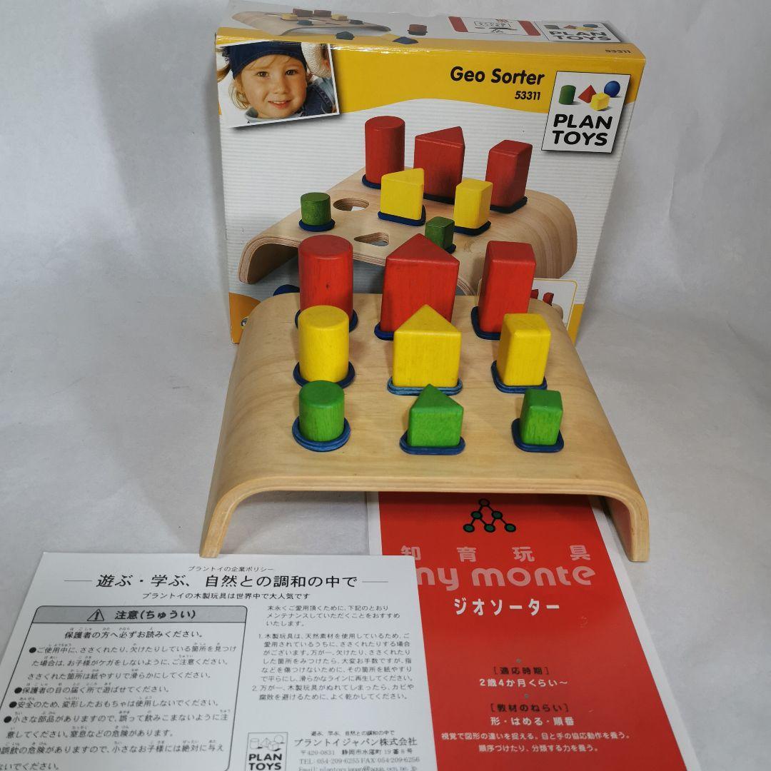 プラントイと学研が共同で開発したマイモンテシリーズのジオソーターです。形と大きさが異なる9つの穴にぴったりのブロックを見つけて1つずつはめていきます。