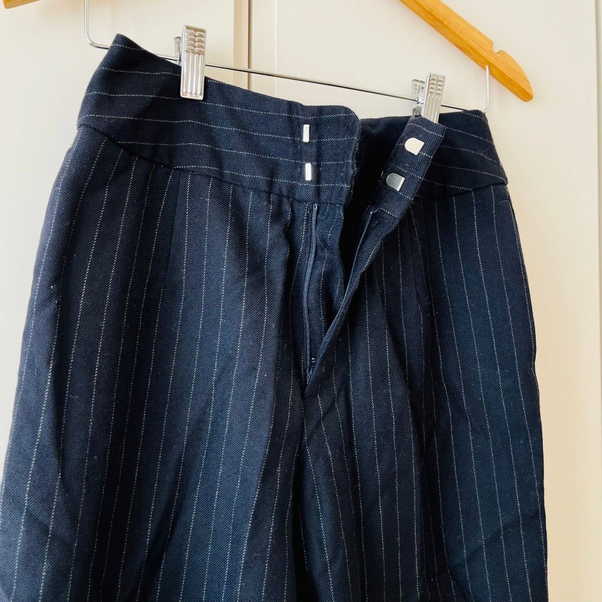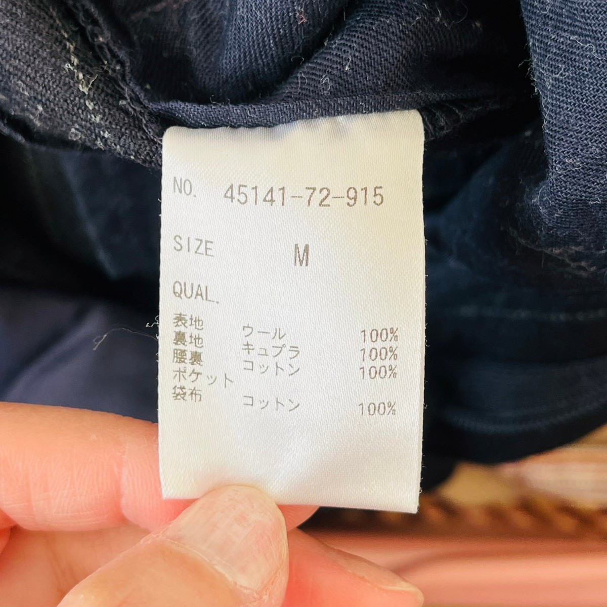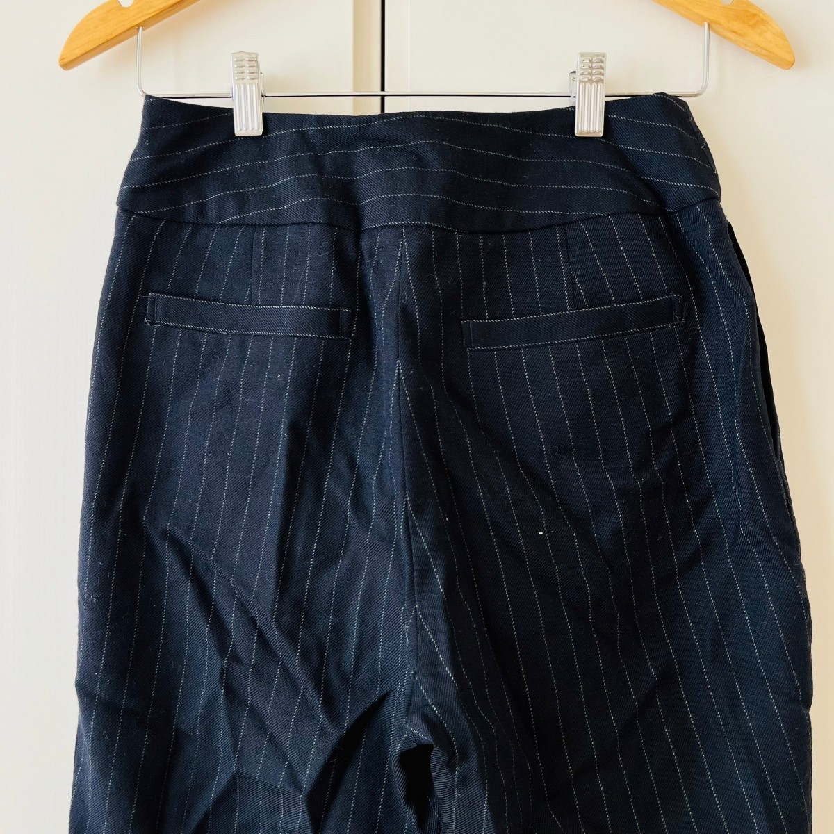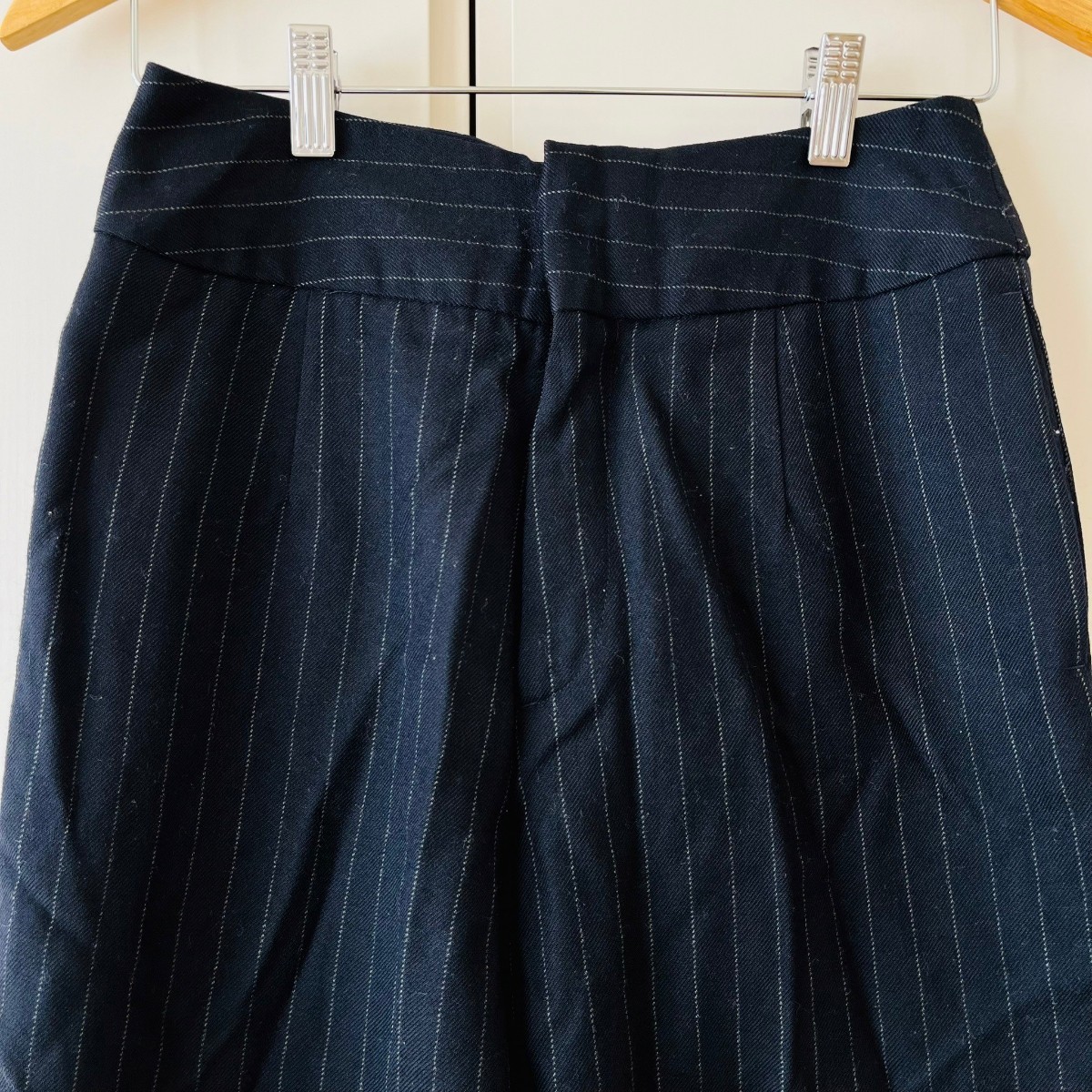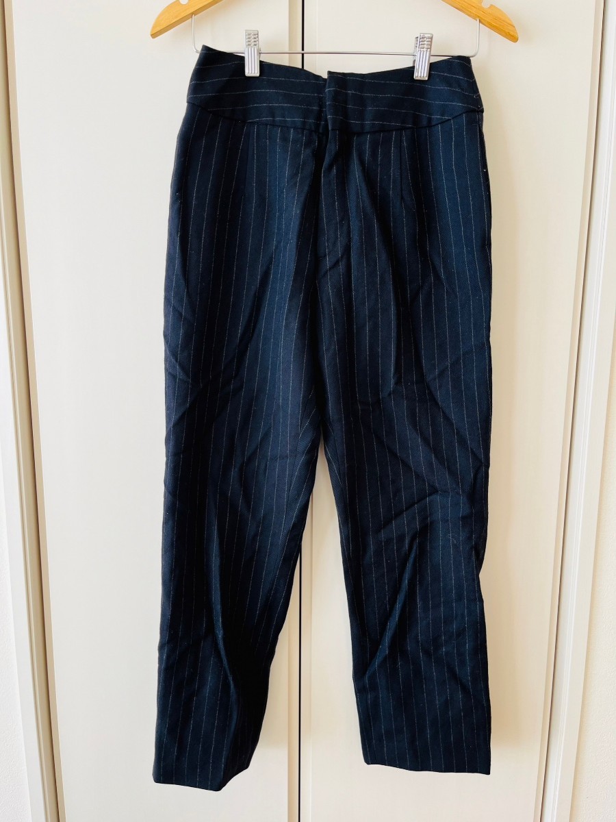 F9067cE 日本製 サザビーリーグ テーパードパンツ ストライプパンツ ネイビー サイズM レディース ウールパンツ きれいめ ウール100%