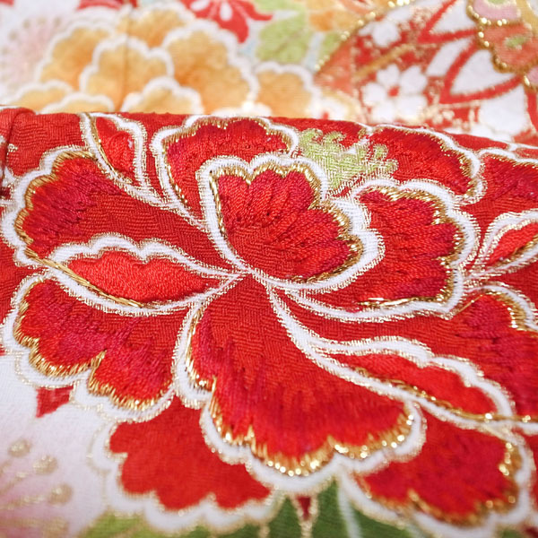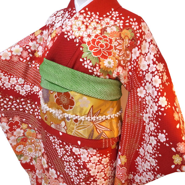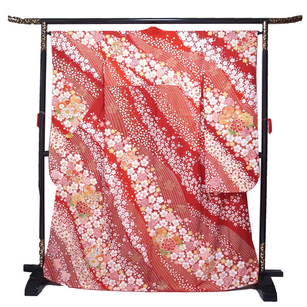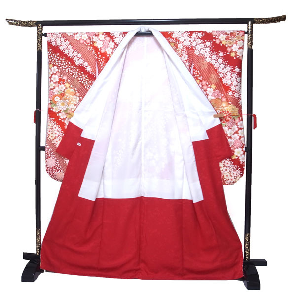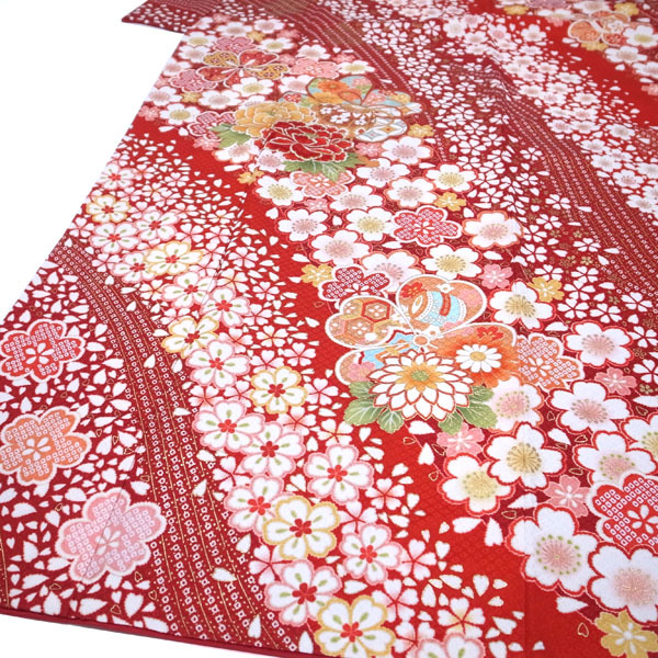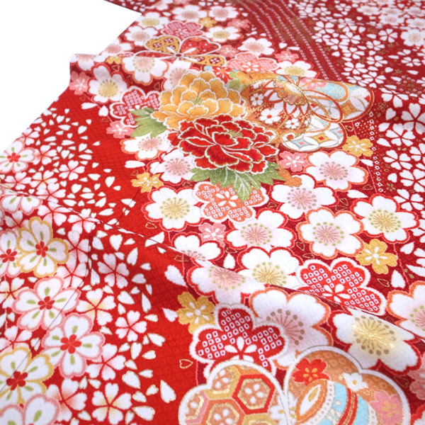 振袖 着物 袷 赤 レッド 金彩加工 地紋 菊 牡丹 桜 鞠 まり 成人式 成人 結婚式 結婚 お祝い リユース リサイクル 正絹 絹 上質 オシャレ おしゃれ お洒落 レディース 女性 女物 女 和服 和装 なごみ 身丈165.5 裄64.5 Mサイズ 中古 仕立て上がり品 sn1040