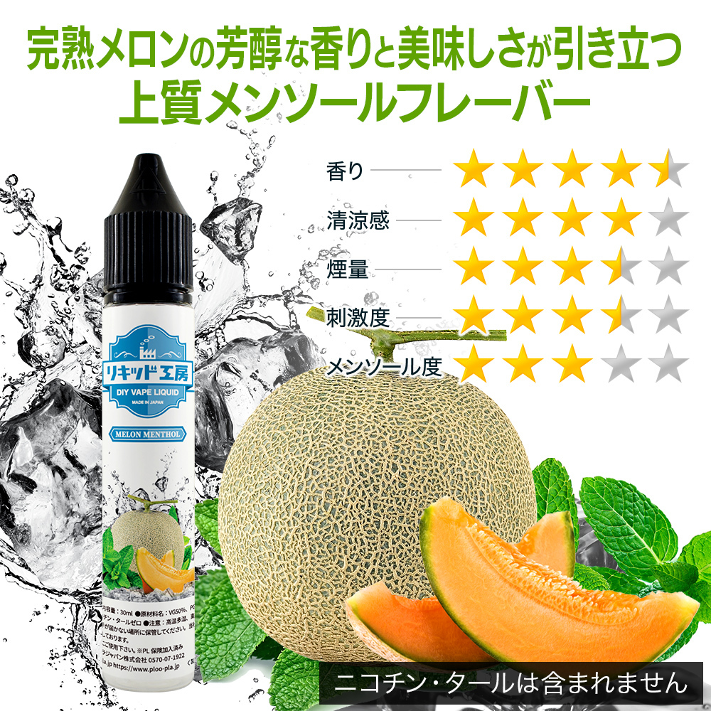 【リキッド工房から30mlシリーズ新登場】完熟メロンの芳醇な香りと美味しさが引き立つ上質メンソールフレーバー独自の製法により監修、製造した本格派フレーバーリキッドです。安心安全な国産。日本国内の衛生管理の行き届いた工場で製造しております。※厚生労働大臣指定の食品添加物のみ100%配合 【最高のコストパフォーマンス】お客様のご要望により国産リキッドメーカーとして素材の品質を落とすことなく味、香りにこだわったリキッドの開発に成功しました。そのままでも十分にお楽しみいただけますし、他のフレーバーや香料等と混合して自分好みの味に仕上げることもできます。<セット内容>リキッド工房 メロンメンソール 1本<商品仕様>■ボトルサイズ:30ml■ボトルタイプ:プラスチックボトル(0.5ml単位目盛付き)■成分:食品用グリセロール純度99.7%・食品用プロピレングリコール99%・天然日本ハッカ・食品用香料■混合比率:VG50%PG50%■香料:ニコチン・タール・有害物質:なし■日本食品分析センター検査済み:発がん性物質検出されず※チャイルドロックキャップです。