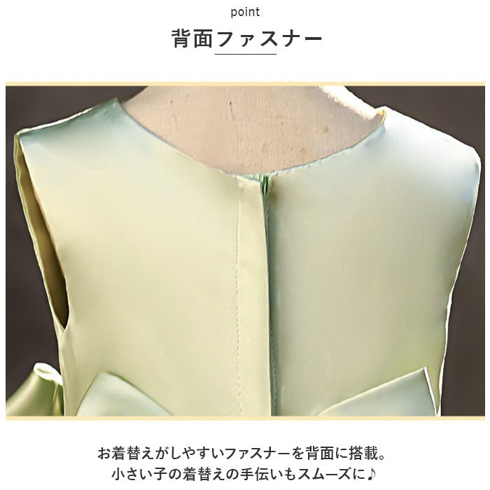 商品説明 | ・・小さなプリンセスに変身♪可愛らしいキッズ用ドレスが新登場。 ・【上品な印象を演出】 ・光沢とハリのある生地を使用し、エレガントな雰囲気に仕上げたドレス。 ・【目を惹くリボンデザイン♪】 ・ウエスト部分と背面の大きなリボンがアクセント! ・2種類のリボンはピンで取り外しが可能なので、その日の気分でリボンの位置を変えられる◎ ・【Aラインシルエット】 ・スカート部分は生地を2枚重ね、ふんわり程よいボリューム感に。 ・【背面ファスナー】 ・お着替えがしやすいファスナーを背面に搭載。小さい子の着替えの手伝いもスムーズに♪ ・【様々なシーンで】 ・お誕生日会、発表会などのイベントやフォーマルシーンで大活躍★ |